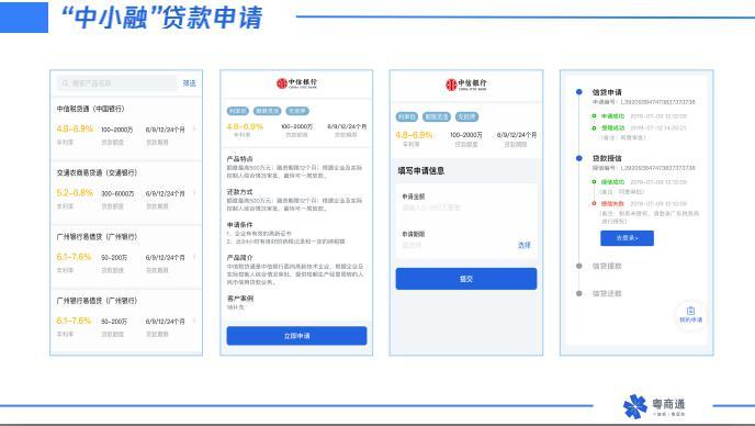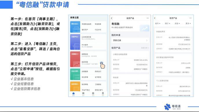 最受企业欢迎的事项还有“融资贷款”,据了解,为着力解决中小企业“融资难”问题,帮助企业方便、快速在现申请贷款,目前“粤商通”已对接粤信融平台(人民银行)、中小融平台(金融局)。