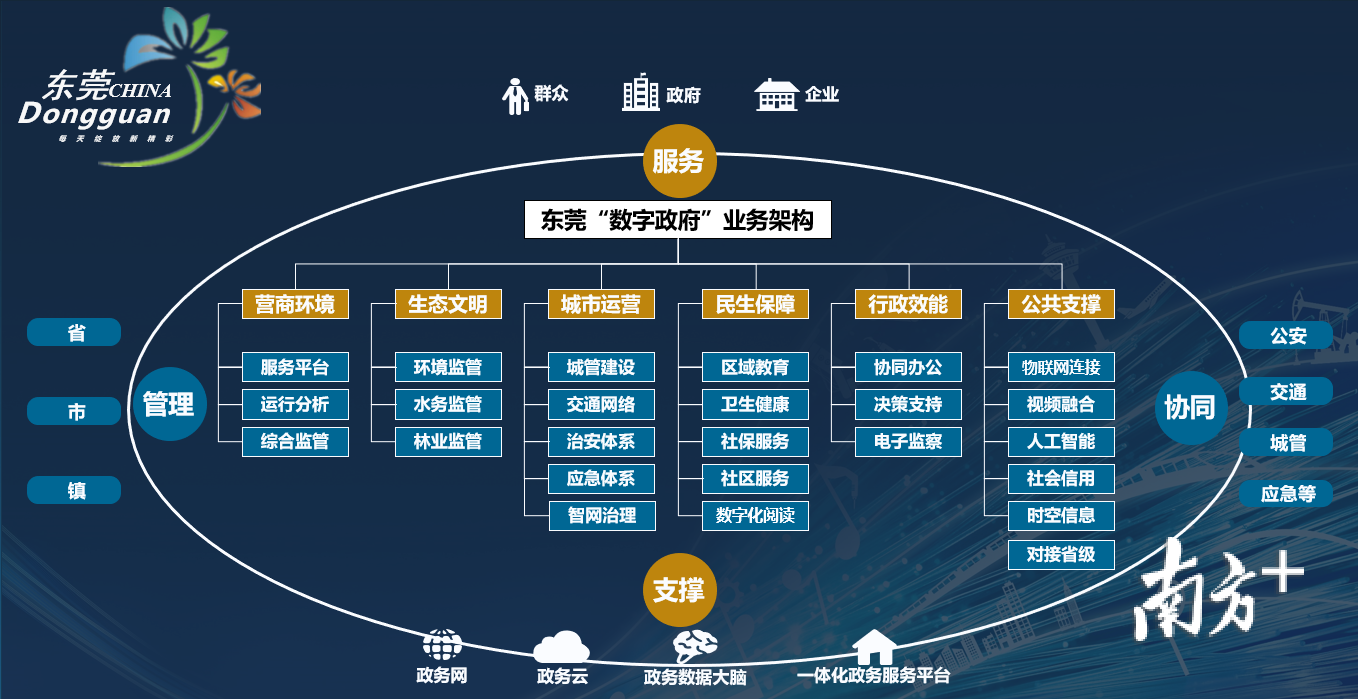 2019年8月,东莞开始实施“数字政府”建设,由该市政务服务数据管理局统筹牵头,打造“云数网一”于一体的政府“数字底座”。目前,东莞“政务数据大脑”项目已完成“一湖四平台”(即数据湖、大数据基础平台、大数据汇聚平台、大数据治理平台、大数据服务平台)、数据分析应用、数据标准等内容的建设工作。