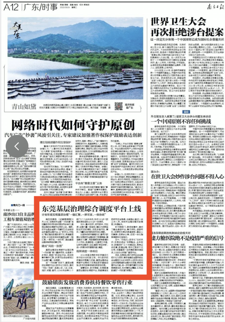 2022年是东莞数字政府建设三年行动计划收官之年。作为数字政府建设成果集大成者,基层治理综合调度平台展现了东莞在数字基础设施、数字防疫等领域的探索和成果。