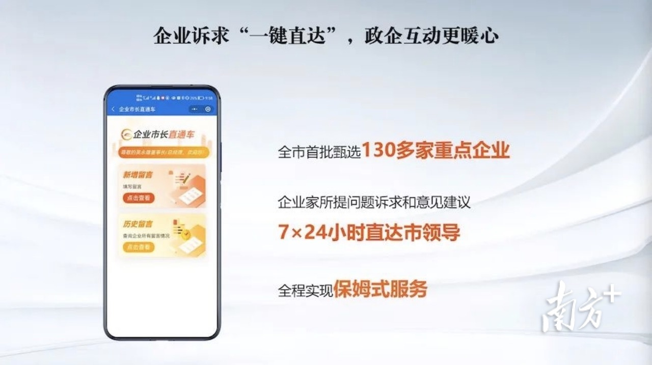去年7月,《东莞市企业市长直通车工作机制(试行)》印发,为全市重点企业主要负责人开通问题诉求直达通道,依托12345热线工单系统,为重点企业主要负责人开设专用账号,企业家可点对点向市长、副市长反映重大问题诉求和意见建议。
