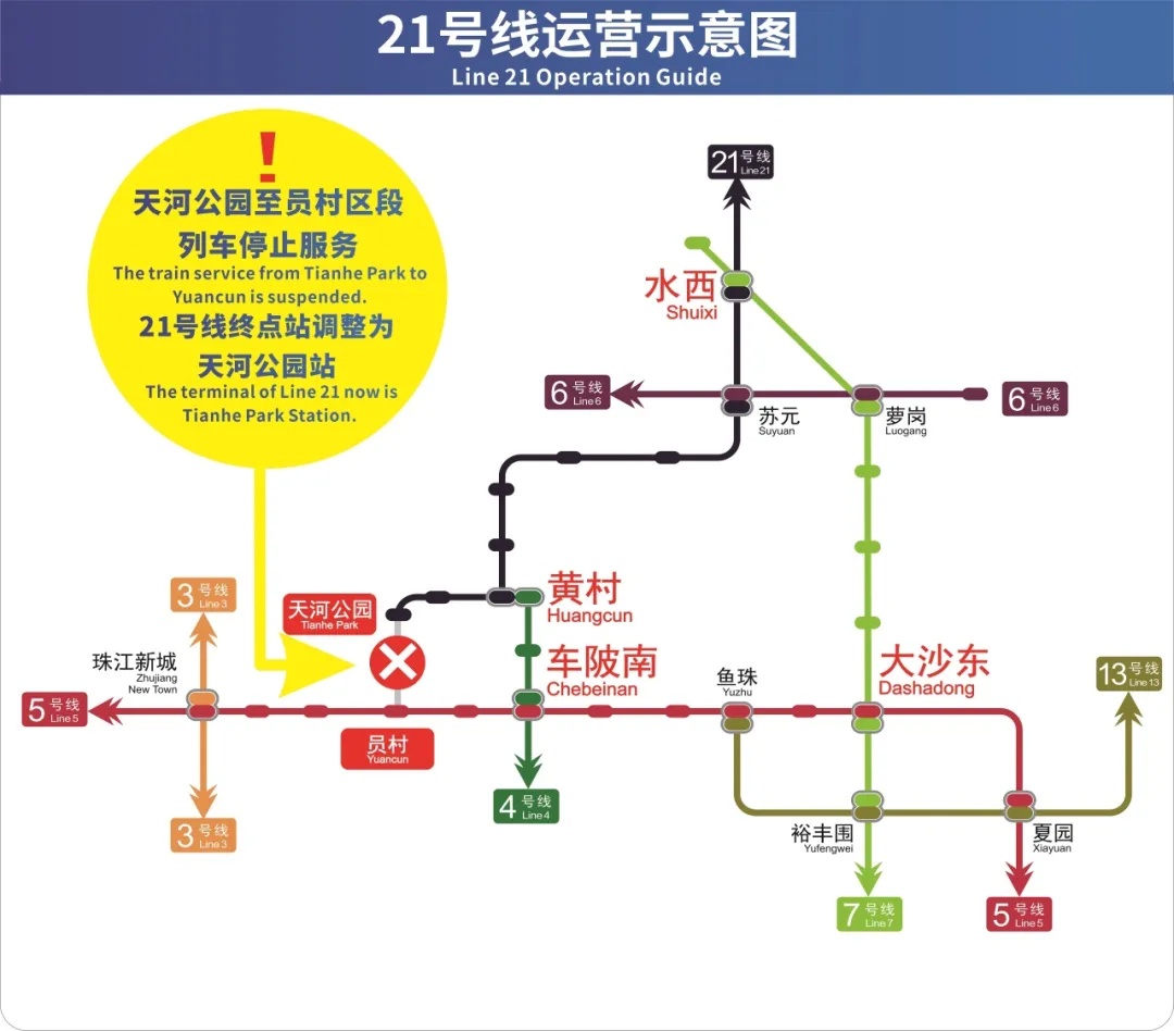 10月8日起,二十一号线将执行新版工作日、周末列车运行图;黄村、棠东、天河智慧城、水西、车陂南、车陂、员村等车站工作日早、晚高峰将视客流情况实施高峰客流控制,请广大市民出行时提前做好时间和路线规划。