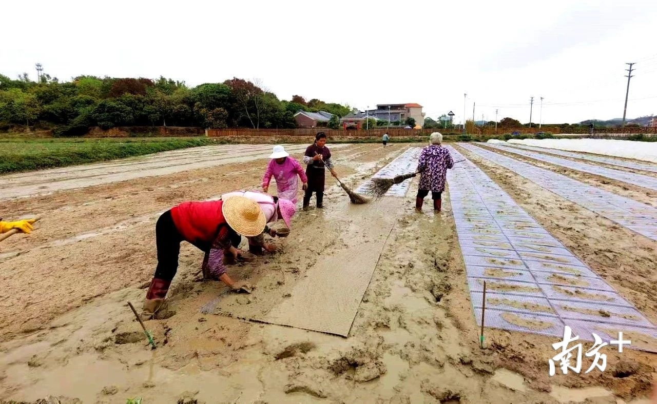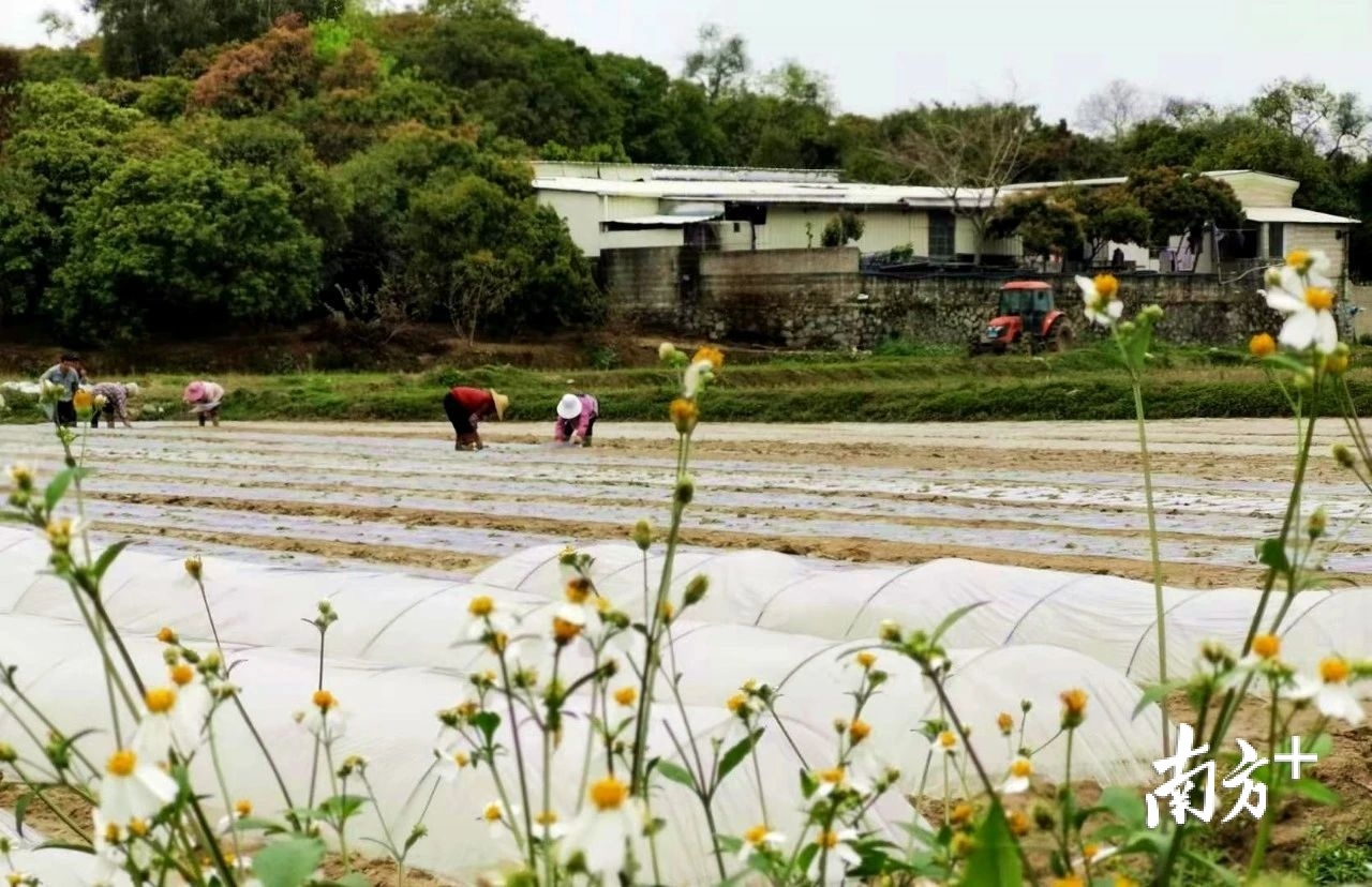 小楼镇江坳村的广州绿聚来农业发展公司种植基地上,几台机器正在田间穿梭往返,犁地翻土。而农户们三三两两,互相配合,有的施肥浇水,有的播种育苗,有的支架覆膜,一派农忙景象。