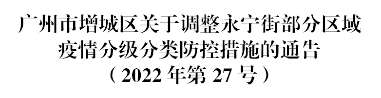 根据疫情处置进展,按照国务院应对新型冠状病毒肺炎疫情联防联控机制综合组《新型冠状病毒肺炎防控方案(第九版)》相关规定,经专家组研判,增城区调整永宁街相关高风险区、中风险区范围和防控措施,现通告如下: