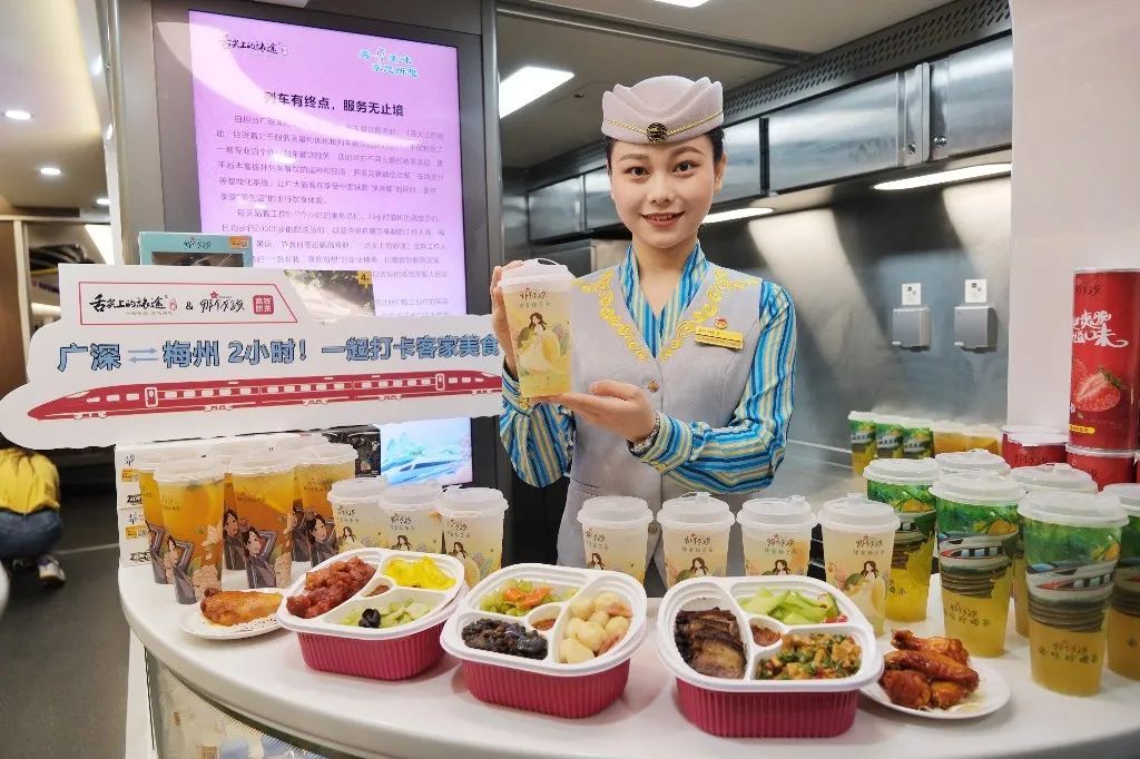 “旅客用喝一杯高铁奶茶的时间,就能轻松抵达目的地。”广铁集团餐饮乘务长黄欣雨介绍,“根据沿途地区美食,餐车上还配有客家梅菜扣肉、荔枝肉、三鲜鱼丸等特色套餐。”