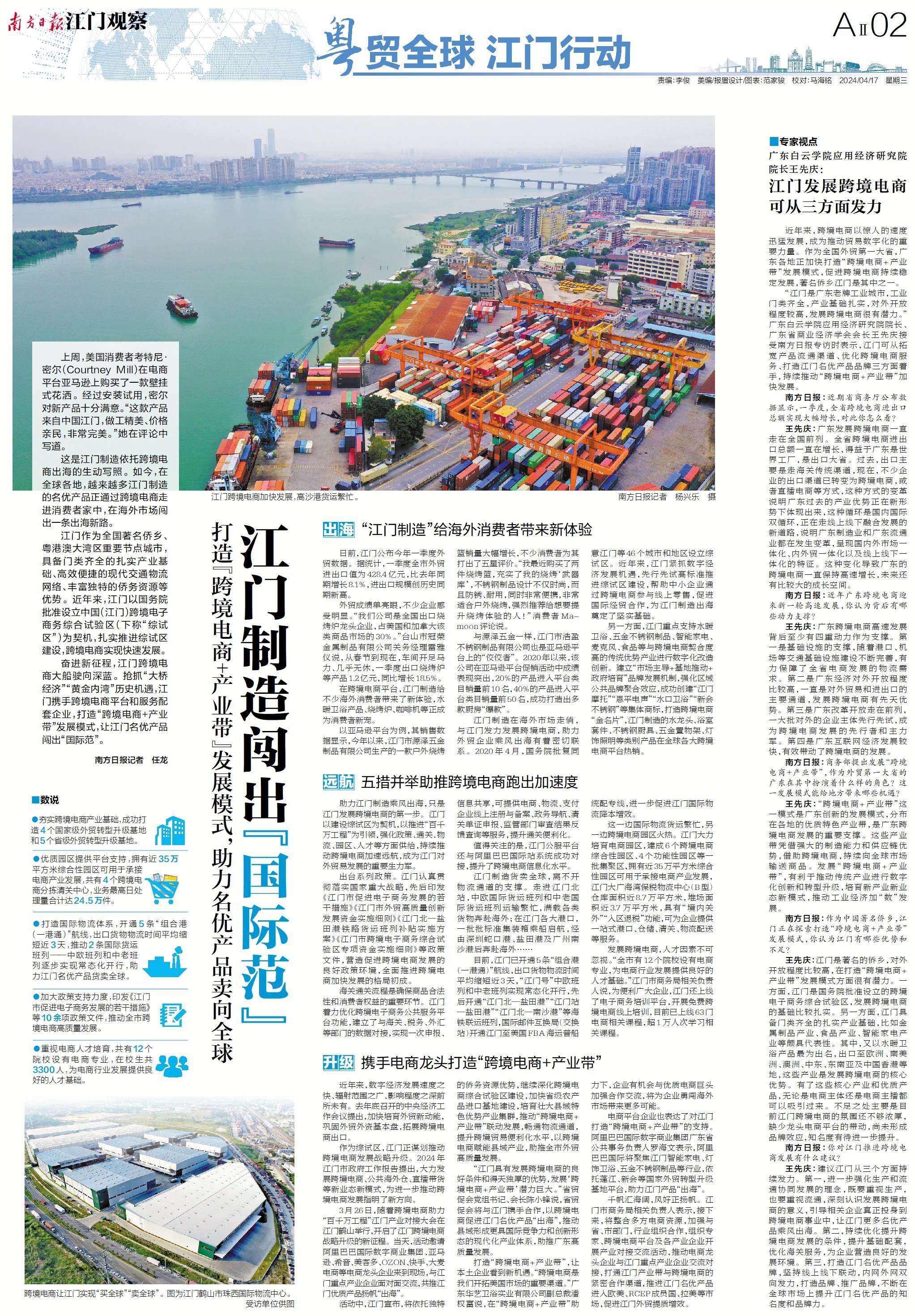“江门工业门类齐全,对外开放程度较高,发展跨境电商很有潜力。”广东白云学院应用经济研究院院长、广东省商业经济学会会长王先庆接受南方+专访时表示,江门可从拓宽产品流通渠道、优化跨境电商服务、打造江门名优产品品牌三方面着手,持续推动“跨境电商+产业带”加快发展。详情>>