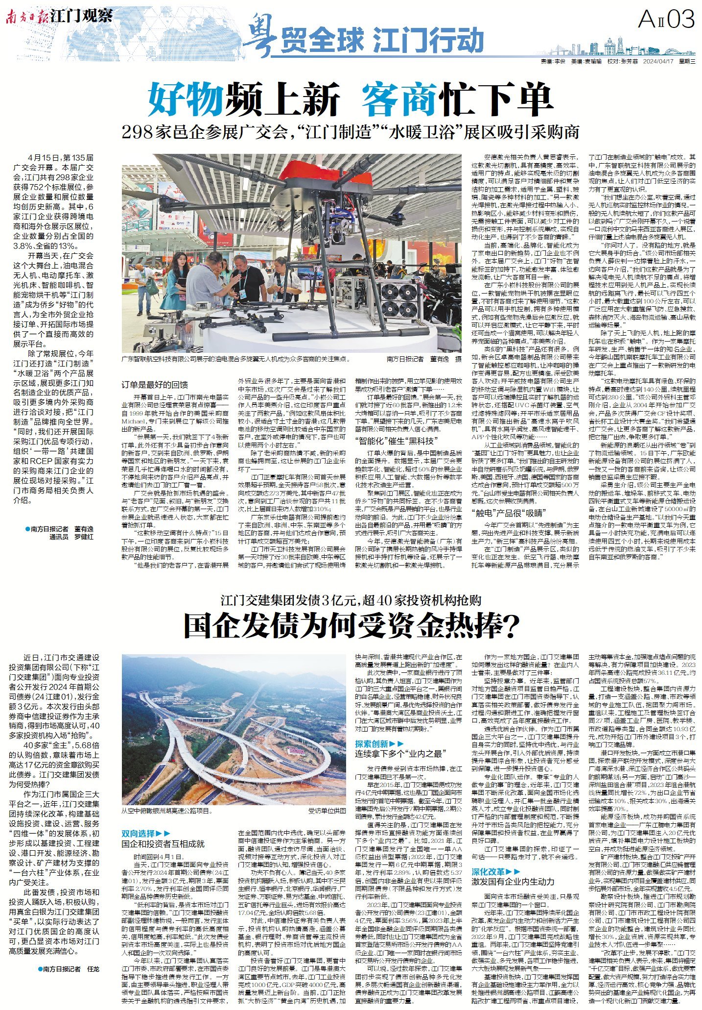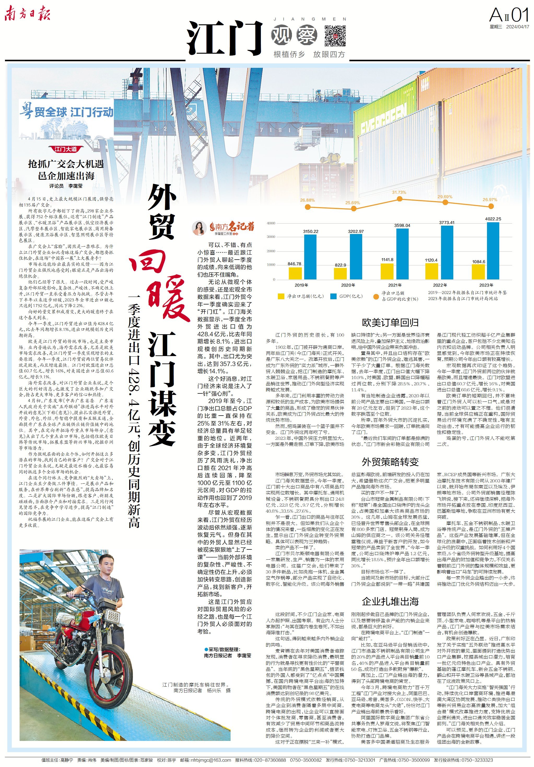 4月17日,《南方日报·江门观察》聚焦广交会和江门一季度外贸数据,从广交会的新景象和外贸数据的新特点中,解读江门外贸的转型升级之路。