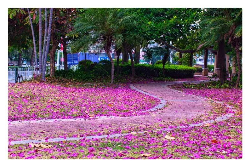 在紫色的雨中绿道、校道漫步,