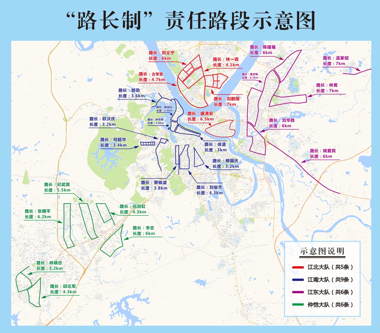 当前,辖区总路长由交警部门各路面大队负责人担任,是道路交通管理的第一责任人,各路面中队负责人为分路长,对中队辖区交通管理承担主要责任。在明确上述职责后,路面中队再按照“一路一路长、一路一团队”的原则,对划分的责任路段指定一名民警担任路长并组建团队。路长可根据实际情况由中队领导或民警担任,团队成员一般由若干辅警组成,在路长指挥下负责责任路段的日常管理和群众工作。