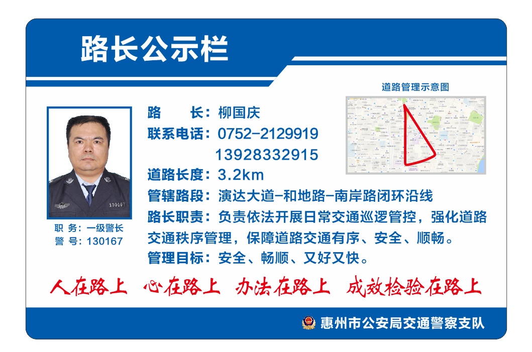 同一天,与柳国庆一样走马上任的路长,惠州市还有25名。为助力全国文明城市迎复检工作,优化公安交通管理勤务运行模式,争创与“建设国内一流城市”相适应的交通管理工作格局,惠州市公安局正式在全市交警部门推行交通管理“路长制”勤务工作模式。