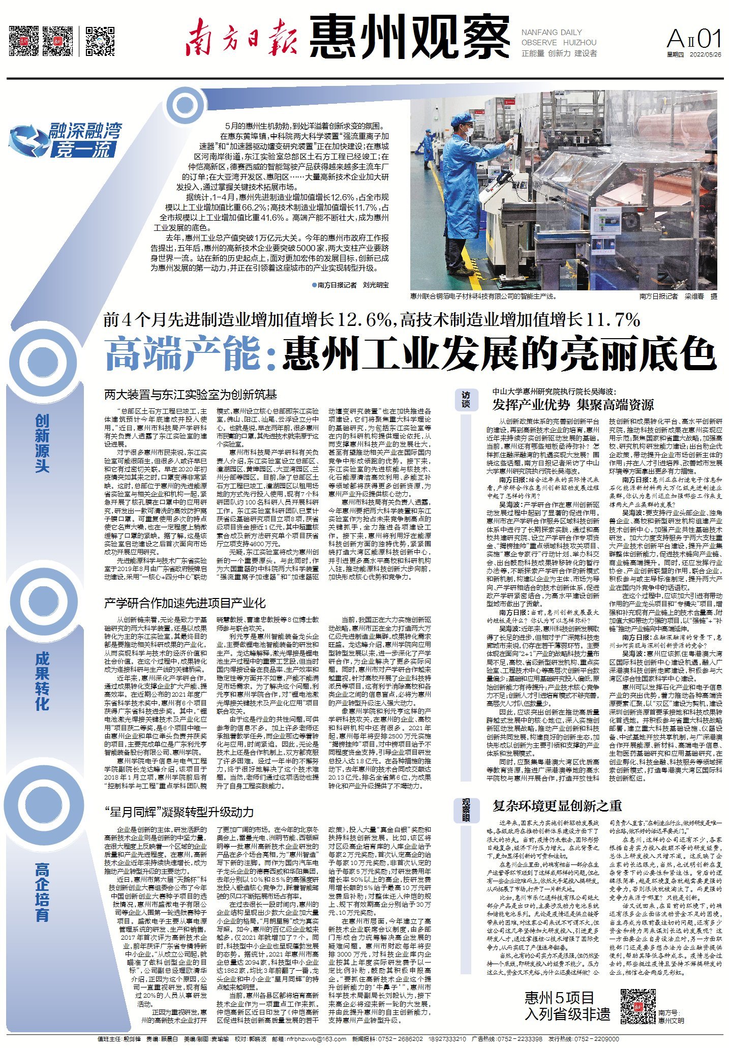 像惠州学院和利元亨这样的产学研科技攻关,在惠州的企业、高校和科研机构中还有很多。2021年起,惠州每年将安排2500万元实施“揭榜挂帅”项目,对中榜项目给予不同程度资金支持,引导企业项目研发总投入达1.8亿元。在各种措施的推动下,去年惠州的技术合同成交额达20.13亿元,排名全省第6位,为成果转化和产业升级提供了不竭动力。