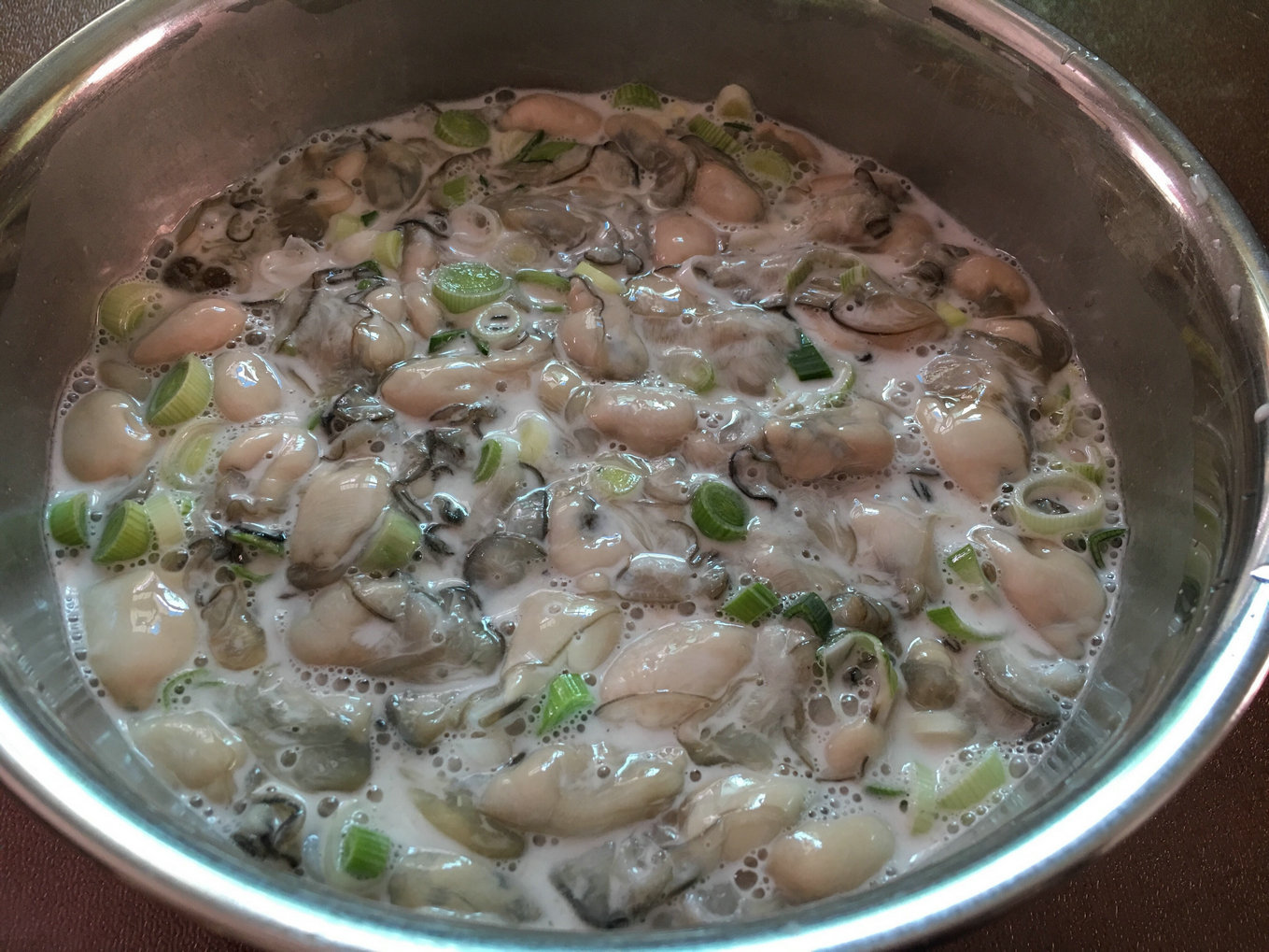 2.将葱白、木薯粉加水拌匀加入生蚝