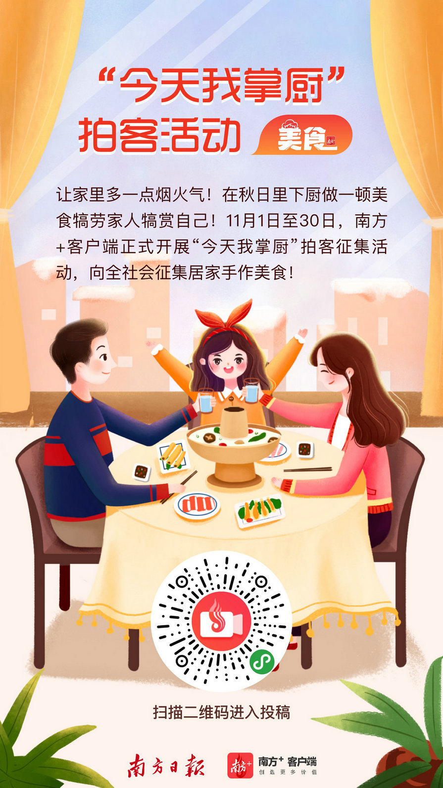 美食频道面向读者开放生产,集纳美食点评、美食攻略等内容,共同打造开放式美食口碑平台。目前,我们正在进行“今天我掌厨”拍客征集活动,向全社会征集居家手作美食的短视频或图文,快来参与拍客活动分享你秋日里在家煮饭的生活吧!还有机会获得南方+、蒙牛联合送出的礼品哦!