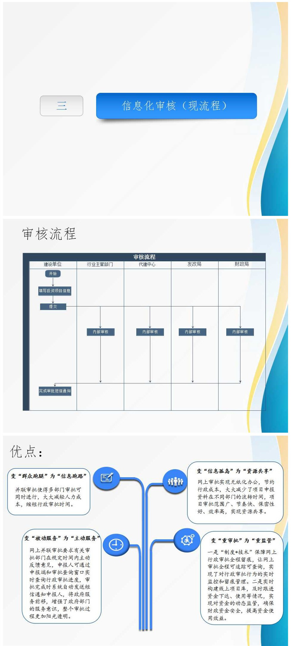 “并联审批”的信息化模式也就慢慢呈现了雏形,新的模式下,自建设单位填写投资项目信息并提交系统以后,系统自动将信息分发至行业主管部门、代建中心、发改部门、财政部门,同时并联审批,审批环节从最多8项压减至3项,并接入短信平台,在审核完成后第一时间告知建设单位,并设置完结提醒等多项功能。
