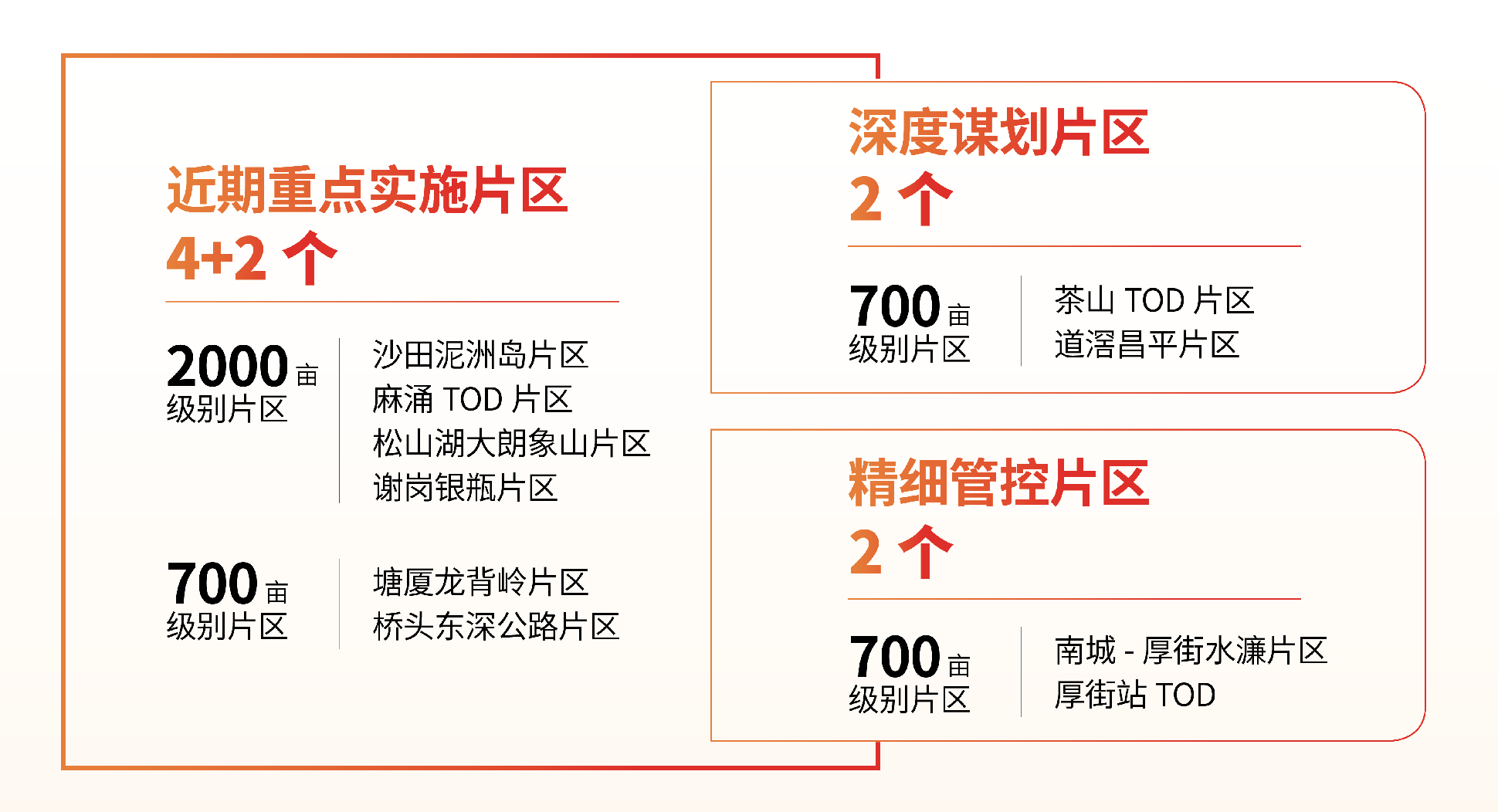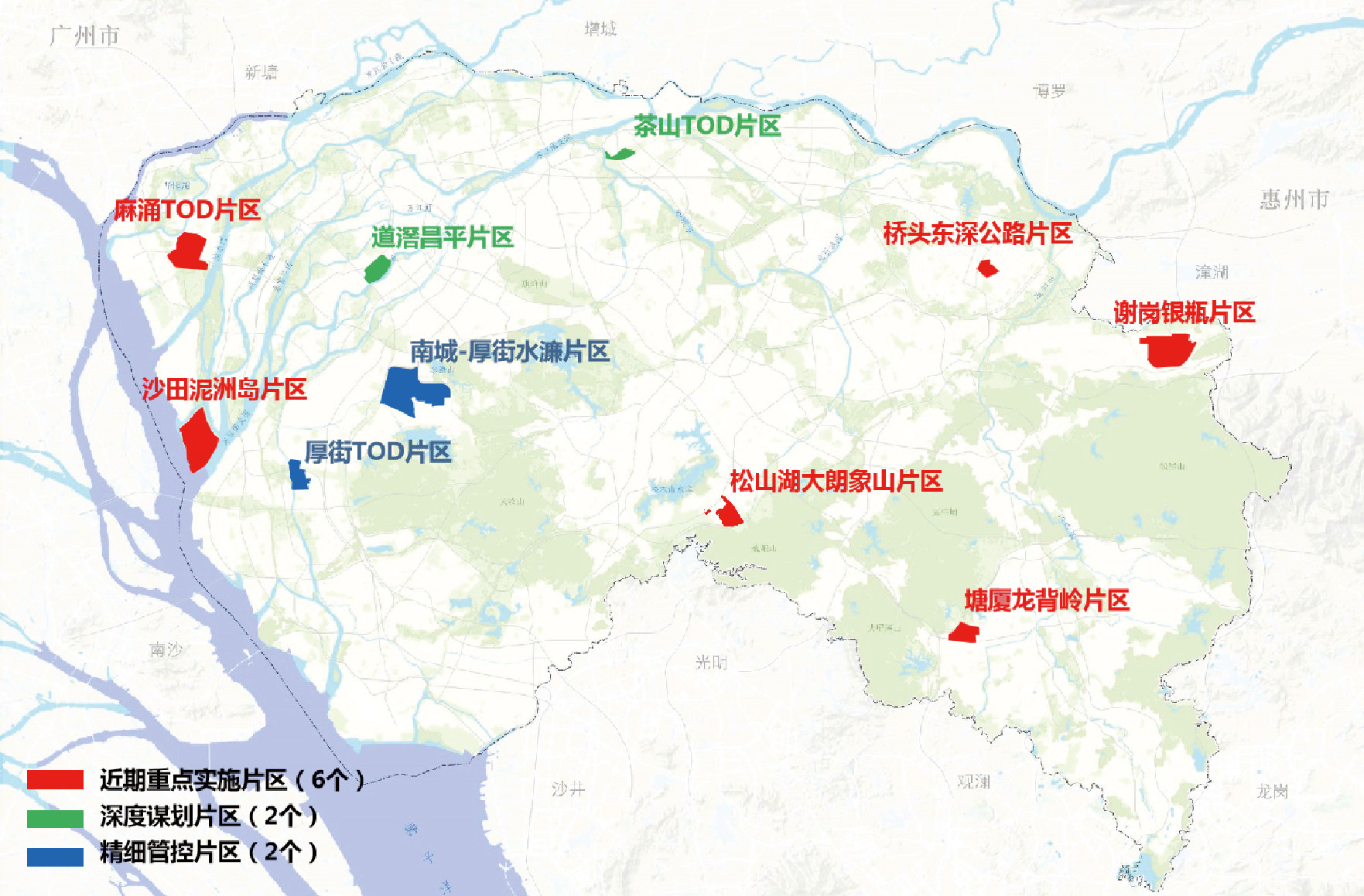 为加大对龙头企业、链主企业的产业空间保障力度,近期,东莞市由市领导分片挂帅,全面启动“4+2”重点实施片区土地整备工作。其中包括沙田泥洲岛片区、麻涌TOD片区、松山湖大朗象山片区、谢岗银瓶片区共4个2000亩级别片区,以及塘厦龙背岭片区、桥头东深公路片区共2个700亩级别片区。此外,东莞还划定了茶山TOD片区和道滘昌平片区2个深度谋划区,南城—厚街水濂片区和厚街站TOD片区2个精细管控区。力争3年整备4片2000亩以上、6片700亩以上连片土地和一批连片“标准地”。