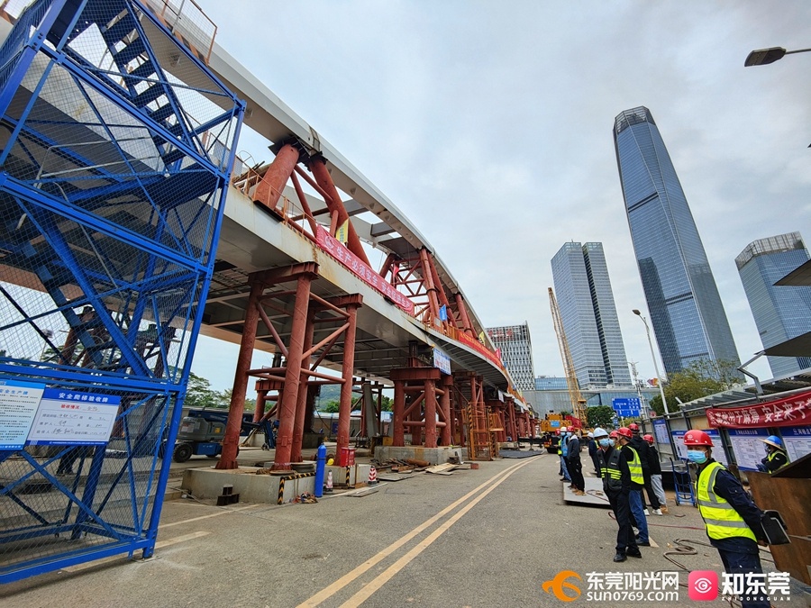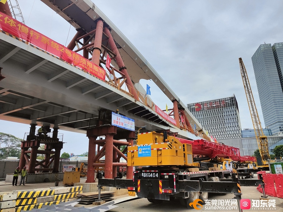12月5日下午,随着一段重1064吨,距离地面高5.5米的钢箱梁稳稳地固定在临时支墩上,标志着由中铁四局承建的东莞市中心区核心地段立体慢行系统2号桥跨东莞大道钢箱梁顶推施工正式开始。