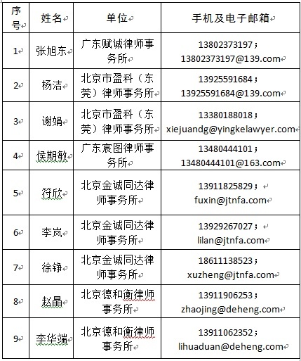 疫情期间,企业可以通过商协会或镇街商务部门反映问题,市商务局将征求相关律师意见后给予回复。企业也可以根据律师团各位律师擅长的领域,通过电话、微信、邮箱等在线渠道直接联系律师,获取法律支持。东莞市涉外律师服务团联系方式如下: