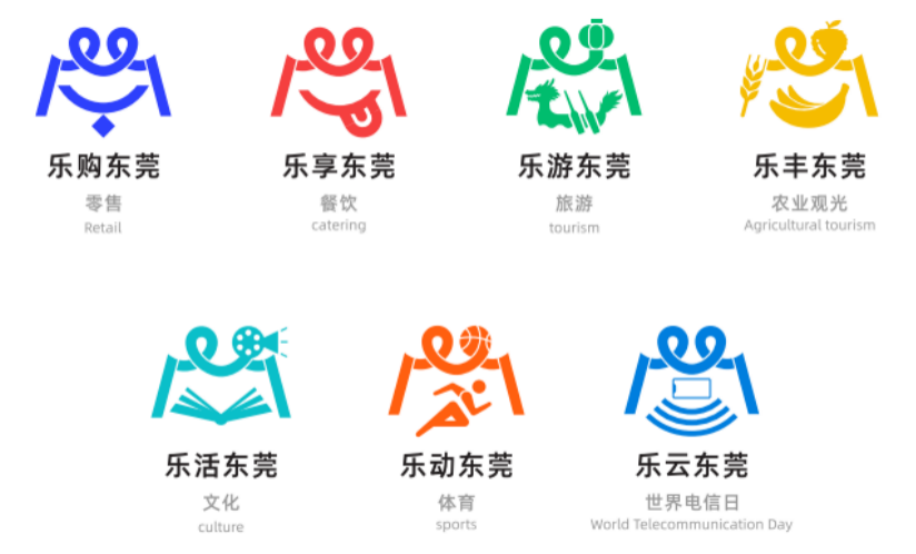从官方释出的短片来看,这次的活动涵盖了零售、餐饮、旅游、农业观光、文化、体育、移动通信7个领域,也分别衍生出了7个不同的子LOGO。子LOGO延续了 主LOGO的微笑曲线,又分别嵌入了对应主题的代表图案,具有辨识度,也非常直观,妈妈再也不怕我认错LOGO错过活动了!
