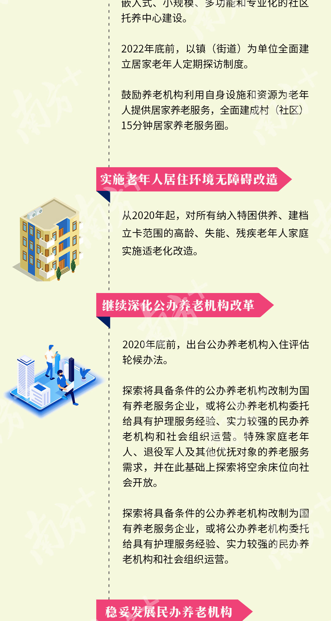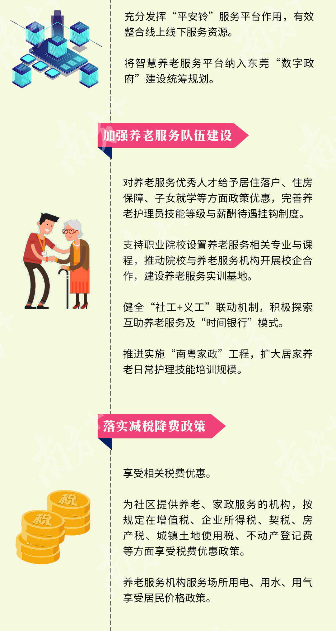 根据该通知,东莞将统筹推进养老事业和养老产业协调发展,着力破解养老服务工作发展障碍,高标准满足东莞老年人多样化、多层次养老服务需求。2020年,形成党委领导、政府主导、部门协同、社会参与的养老服务工作机制。到2021年,市、镇、村三级养老服务网络全面建成。到2022年,养老服务供给结构不断优化、社会有效投资明显扩大、养老服务质量持续改善、养老服务消费潜力充分释放,老年人及其子女获得感、幸福感、安全感显著提高。