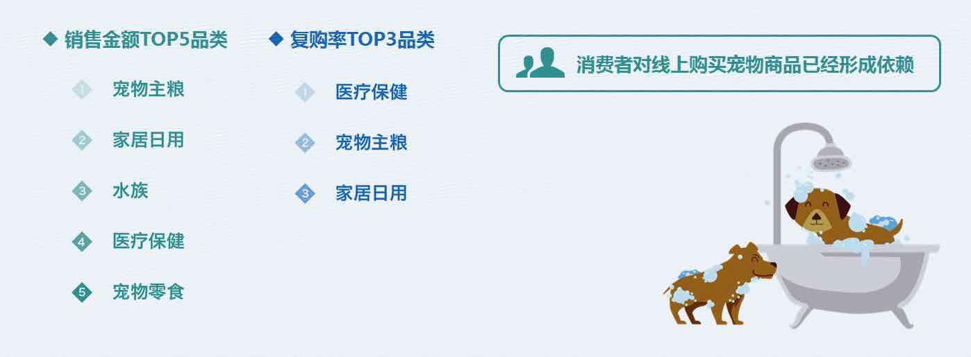 随着宠物经济市场的蒸蒸日上,围绕着宠物从出生到死亡的整个过程,已形成了一条包括宠物培育、宠物交易、宠物食品、家居日用品、医疗保健、宠物美容、宠物培训、宠物保险等一系列商品和服务的“宠物链”。数据显示,目前以医疗保健为代表的宠物专业服务已领衔复购率TOP3品类。