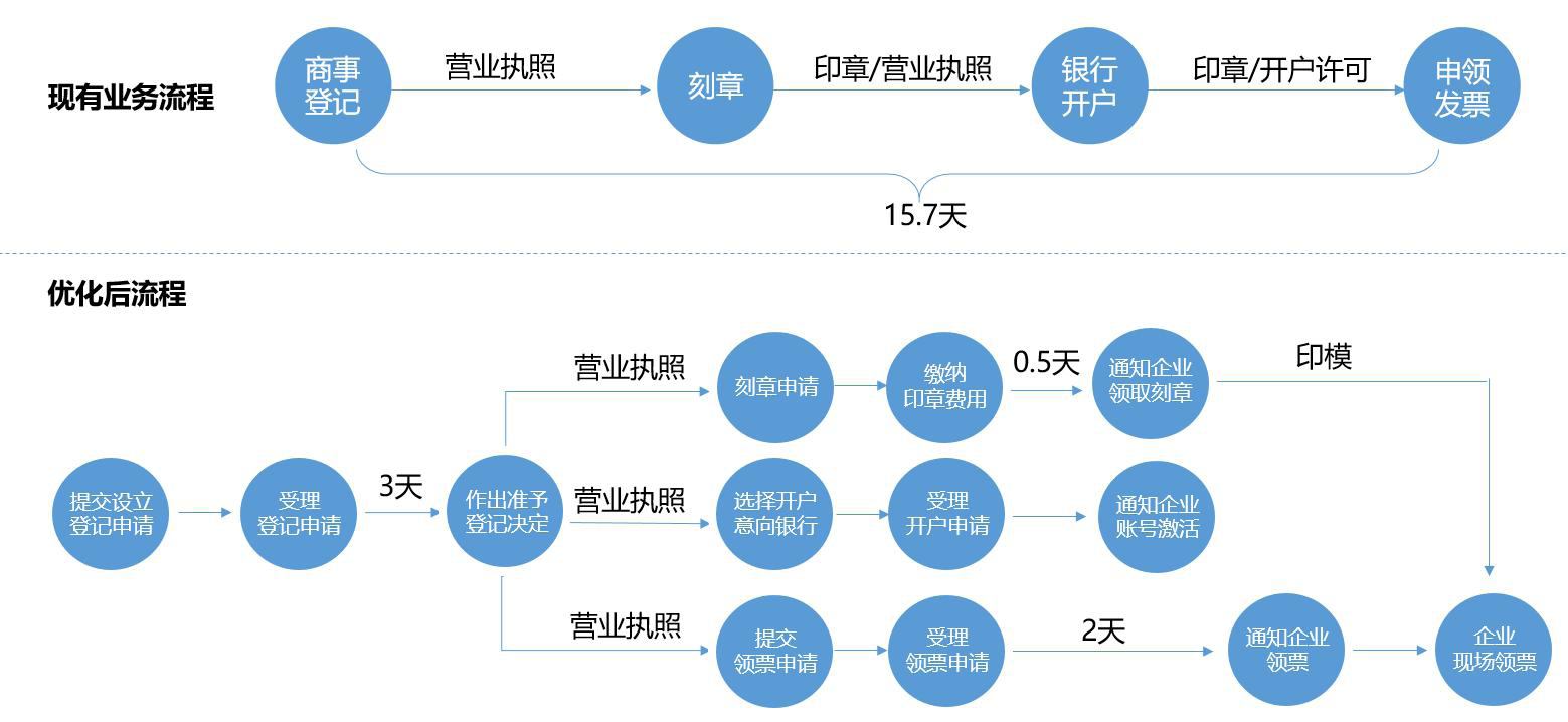 “一窗受理”系统上线后,将全面优化开办企业程序,缩减办事链条,压缩办理时限,优化我省营商环境,便利投资创业。“一窗受理”系统上线后,开办企业的便利化主要体现在五个方面:一是在工商和市场监管部门做出准予登记的决定后,将刻章、申领发票,以及预约银行开户三个环节由串行改为并行,企业可同时进行刻章申请、领票申请以及选择企业开户意向银行。二是企业在线提交刻章申请,选择刻章网点、材料类型、刻章类型(公章、财务章、法人章等),并在线缴纳印章费用,待刻章店完成印章刻章后,通知企业领取印章。三是企业在线提交领票申请,待审核通过后,企业携发票专用章印模到办税服务厅进行资料确认并办理税控设备发行后领取发票。四是企业在线预约银行网点开户,提交预约后,银行工作人员联系经办人到网点进行开户申请。五是开办企业时间整体压缩至5个工作日内:①商事登记时间为工商和市场监管部门受理企业设立登记申请至作出准予登记决定的时间,压缩至3个工作日内。②刻章时间为企业缴交刻章费用至公章制作单位通知企业领取印章的时间,压缩至0.5个工作日内。③申领发票时间为主管税务机关受理新办纳税人“套餐式”服务申请至通知企业可领取发票的时间,包含实名办税信息采集、“多证合一”登记信息确认、财务会计制度及核算软件备案、存款账户账号报告、增值税一般纳税人登记、发票票种核定、增值税专用发票最高开票限额(不超过十万元)行政许可、增值税税控系统专用设备申购、发票领用等新办纳税人办理税务法定义务事项和首次申领发票事项的时间,压缩至2个工作日内。