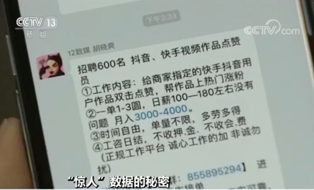 在微信和微博的聊天群里,记者也发现大量公开招募所谓点赞人员的信息。记者以应聘身份申请加入其中一个聊天群,名为“接待老师摇钱树”的管理员简单询问了记者的年龄和可支配时间,就向记者发来了工作要求——为指定客户的抖音账号添加关注和点赞,完成即算一单,可获得1-3元不等的报酬。单日工作量不设上限,工资也可当日结清。