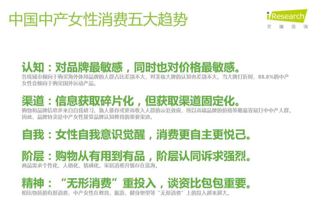 《报告》指出,目前中国中产女性有五大消费趋势,分别是:对品牌最敏感,也对价格最敏感;信息获取碎片化,但获取渠道固定化;自我意识觉醒,消费更自主更悦己;购物有阶层认同诉求,追求从“有用”到“有品”;“无形消费”重投入。