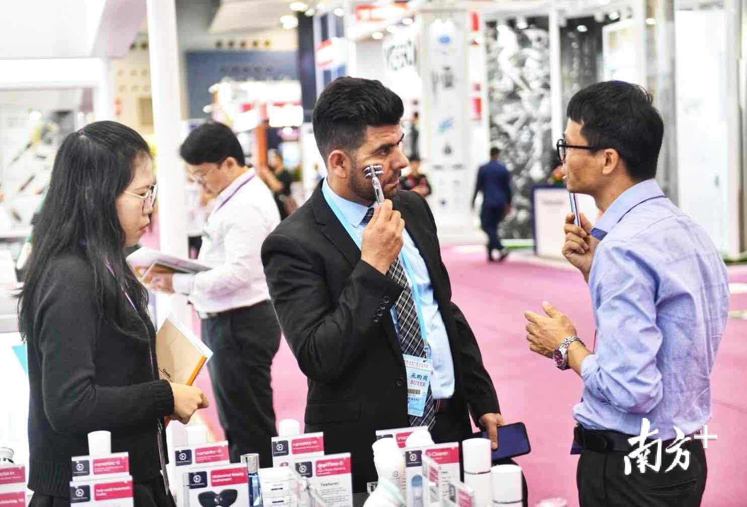 在湛江阳和外贸服务公司展位上,一个不起眼的纸板吸引了不少采购商。