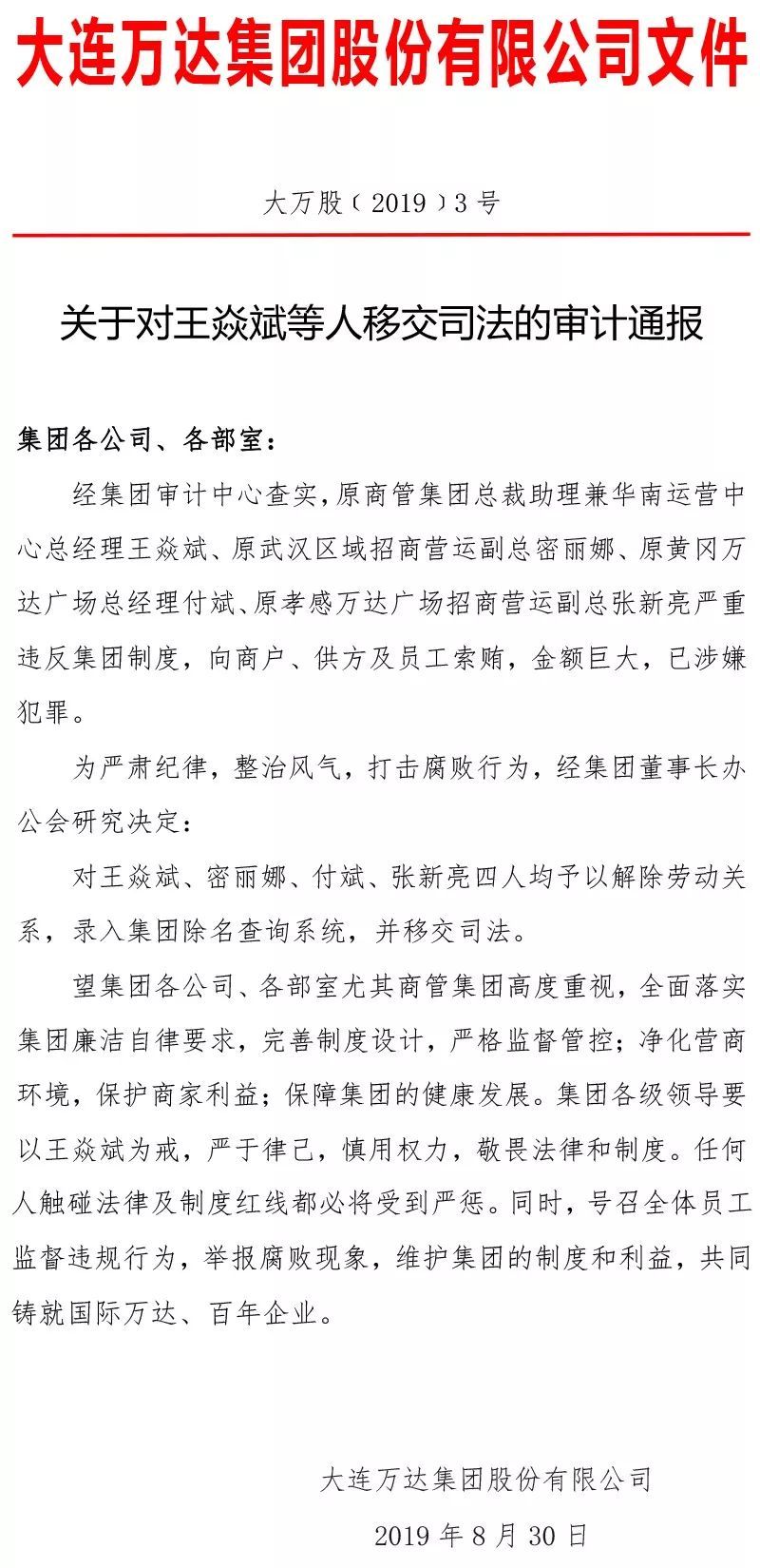 8月30日,万达集团发布内部公告称,8月30日万达集团召开了廉洁与遵章守纪教育大会,经集团审计中心查实,商管集团原总裁助理兼华南运营中心总经理王某、武汉区域原招商营运副总经理密某、黄冈万达广场原总经理付某、孝感万达广场原招商营运副总经理张某严重违反集团制度,向商户、供方及员工索贿,金额巨大,已涉嫌犯罪。
