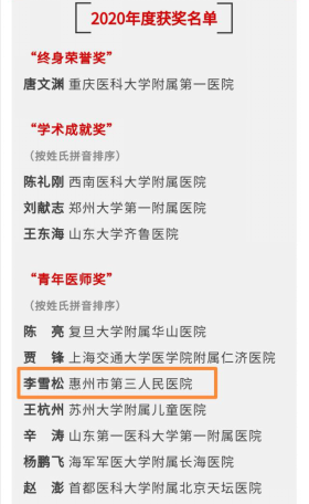 10月27日,“2020年度王忠诚中国神经外科医师年度奖-青年医师奖评审会”在清华大学玉泉医院成功举办!会上,惠州市第三人民医院副院长李雪松博士荣获“2020年度王忠诚中国神经外科医师年度奖-青年医师奖”。据悉,这也是中国神经外科医师的最高荣誉奖项。