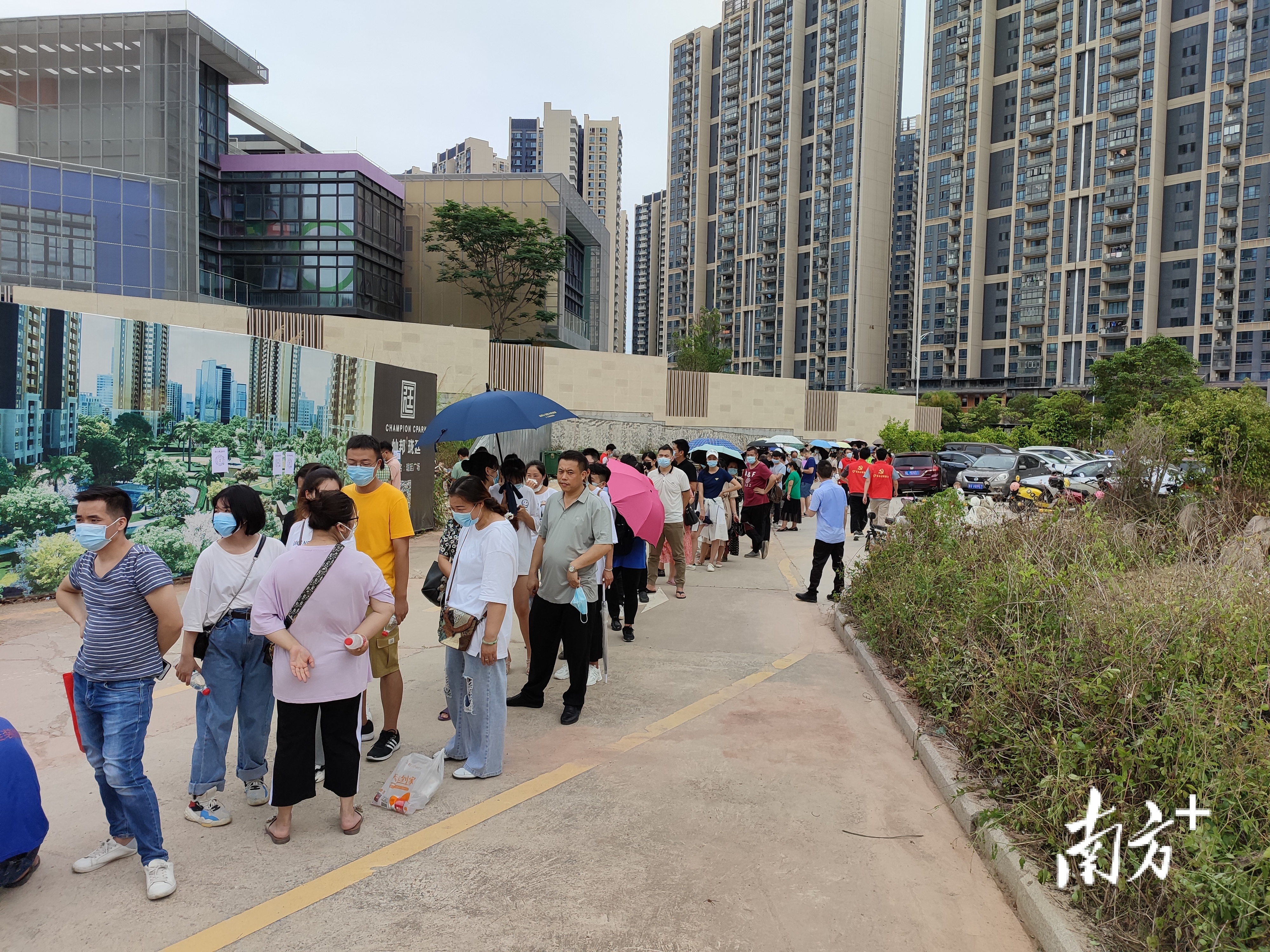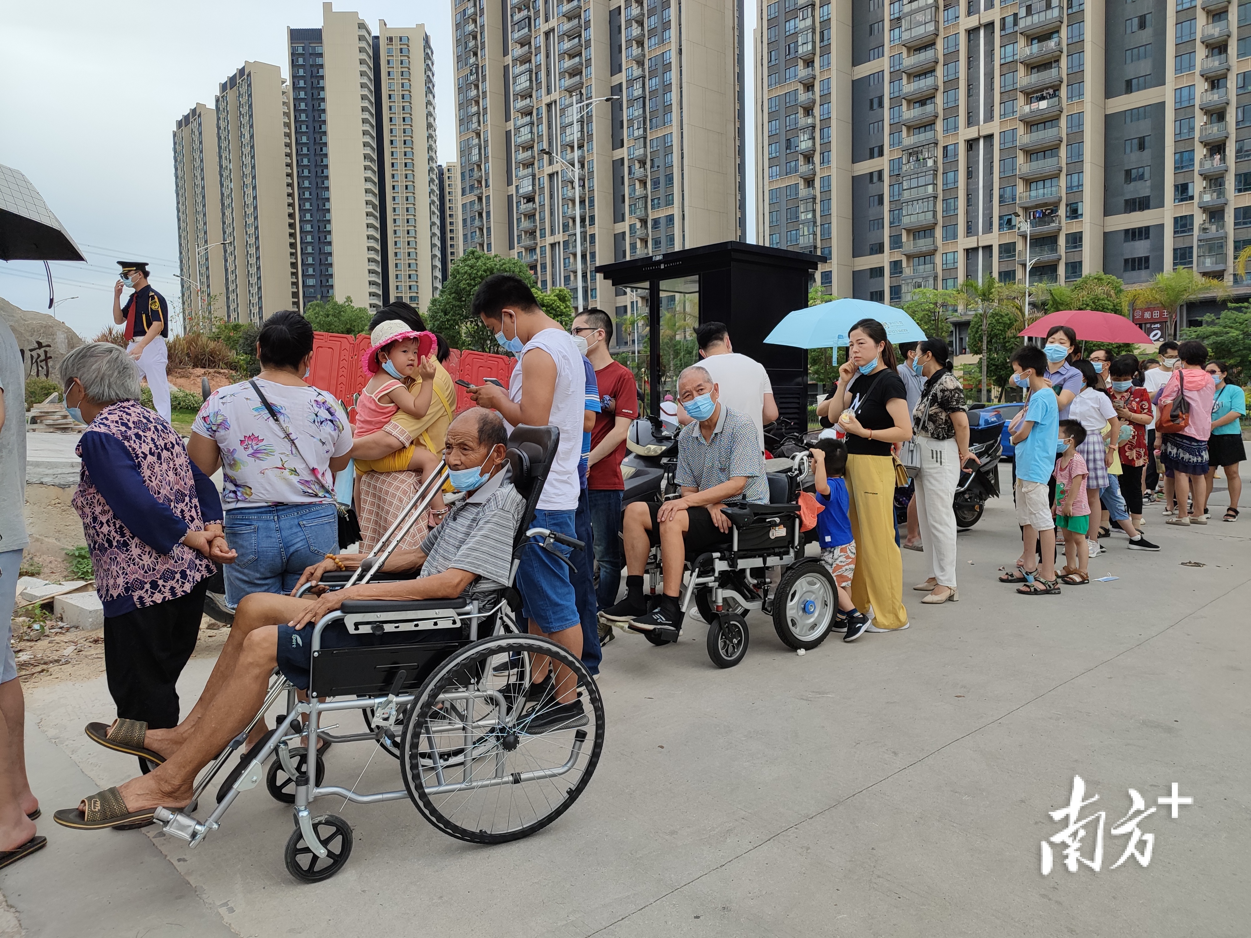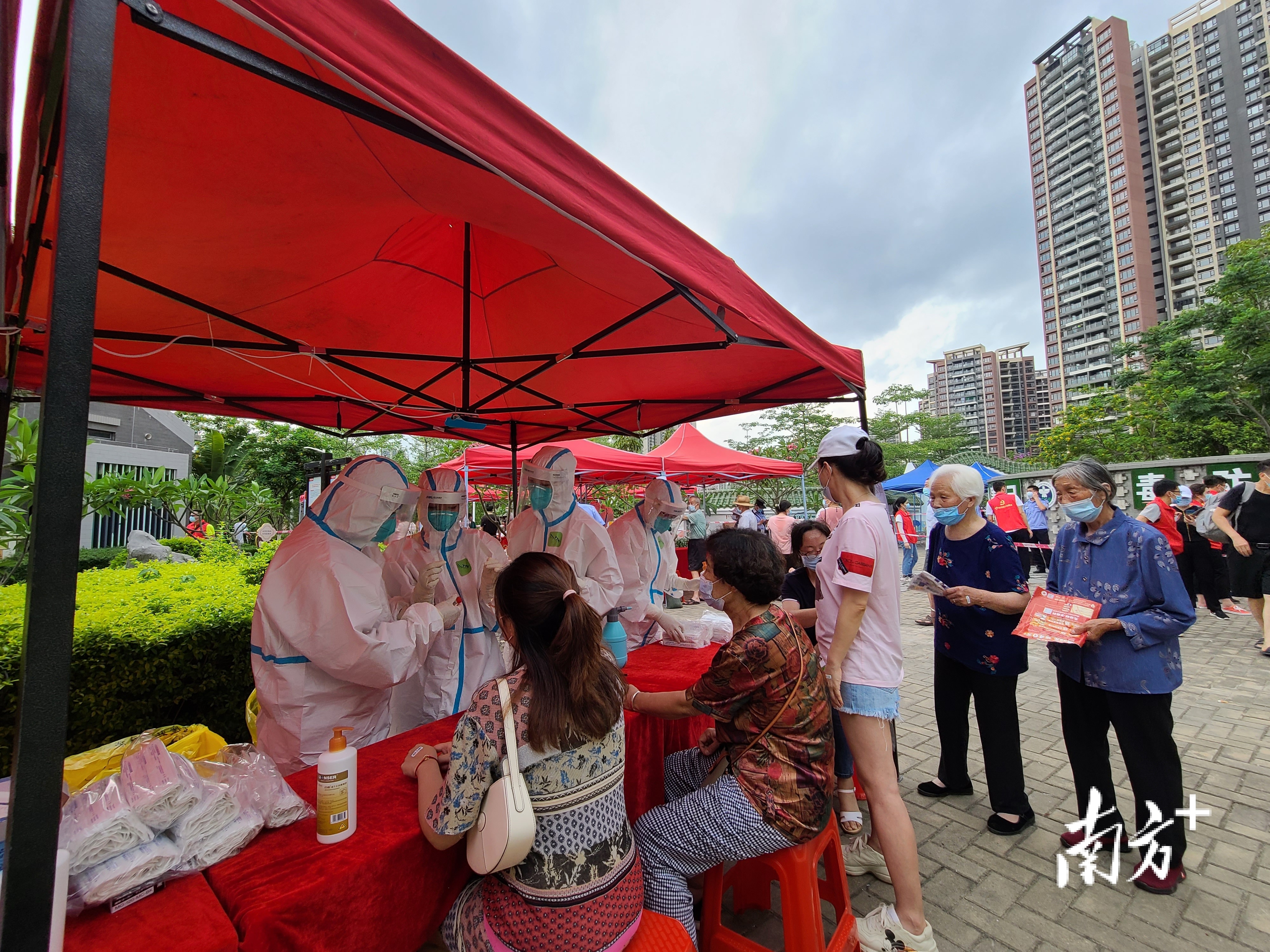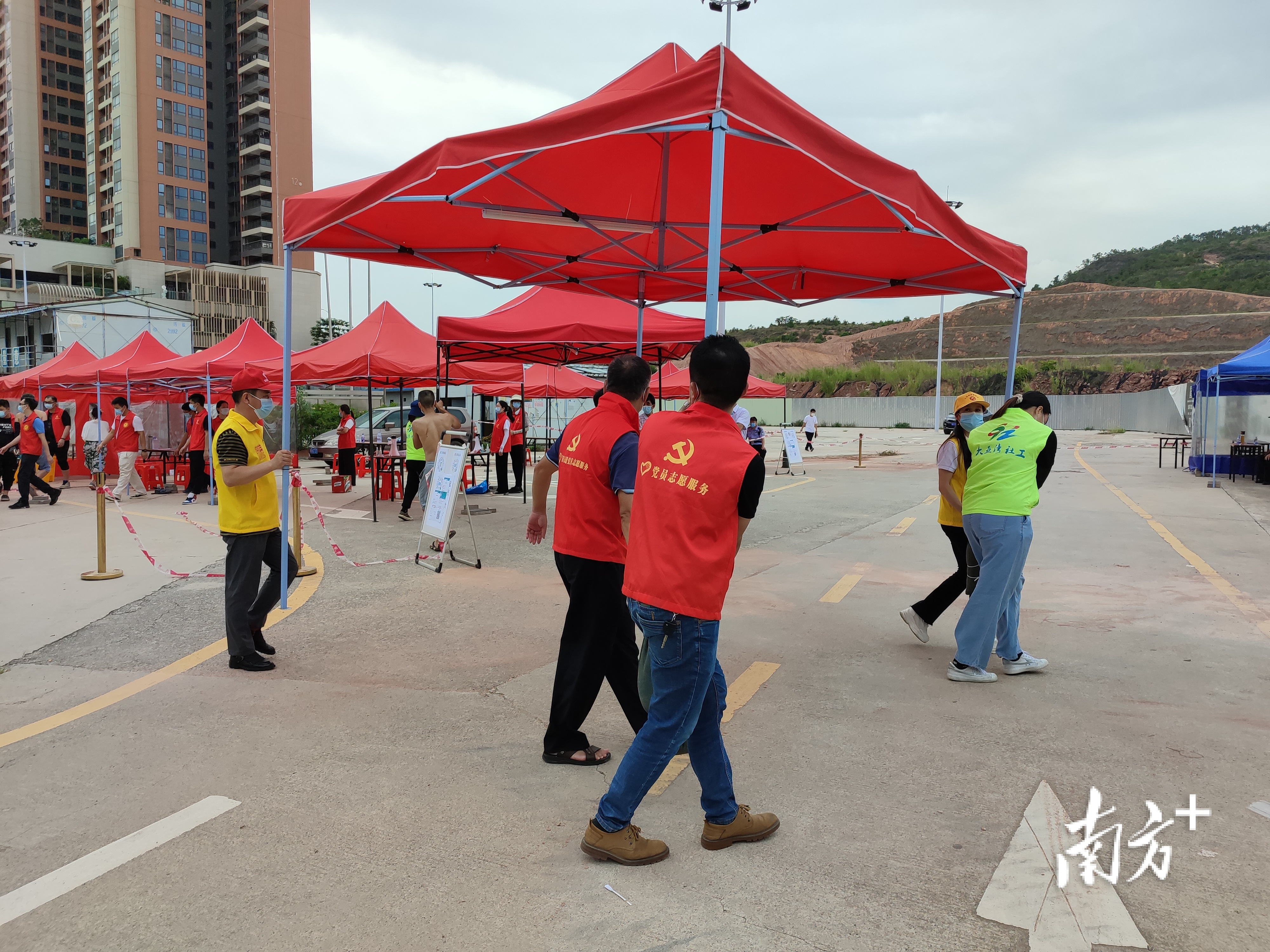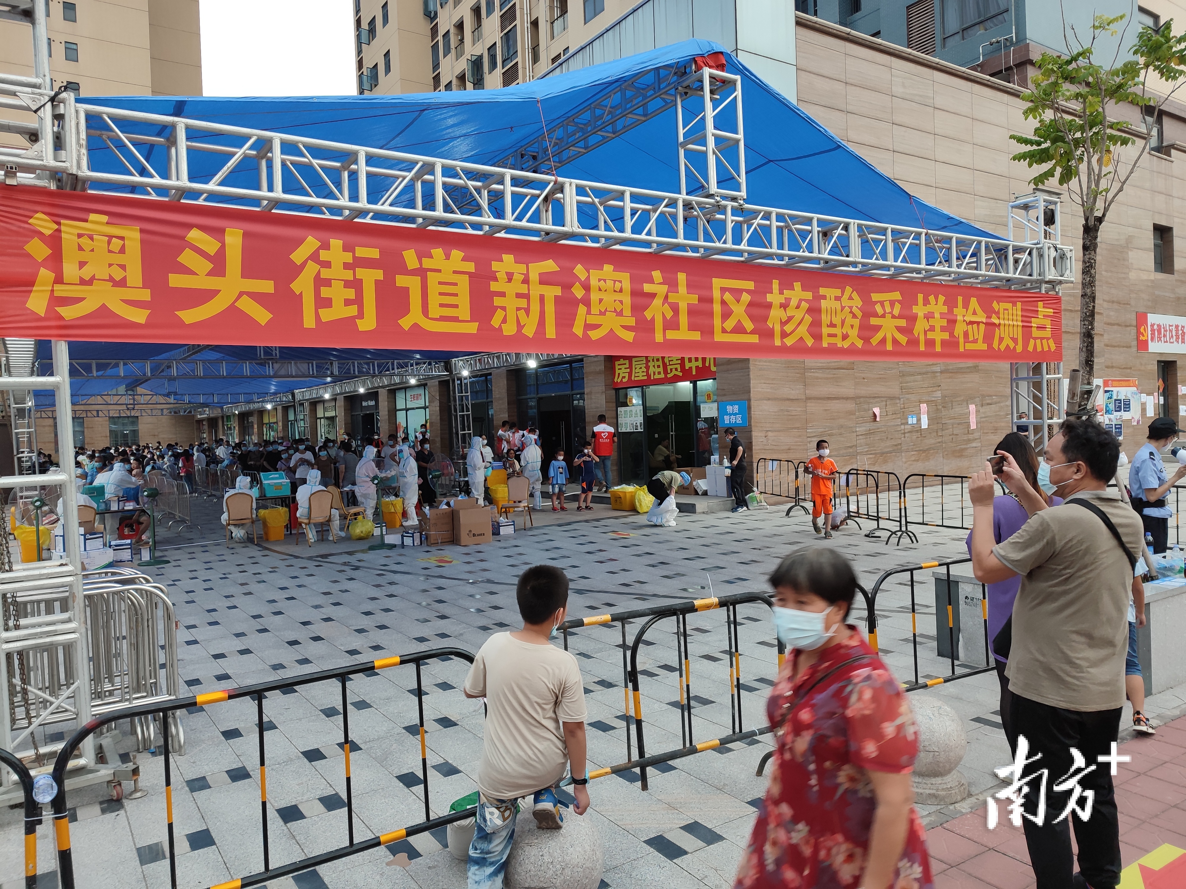 在大亚湾澳头街道的新澳社区检测点,社区在现场搭建了临时的遮阳棚和风扇等,居民有序排队等候采样检测。