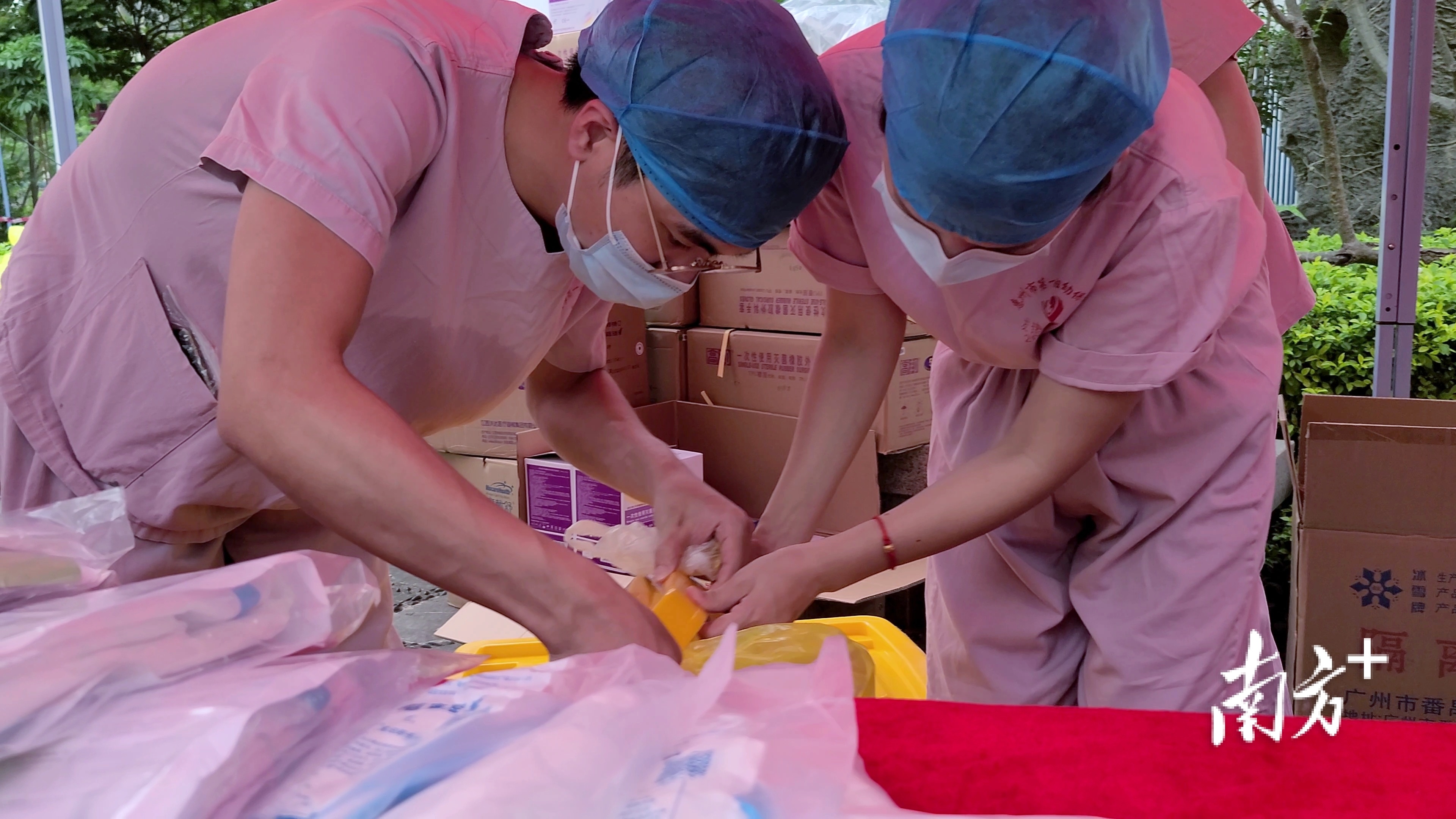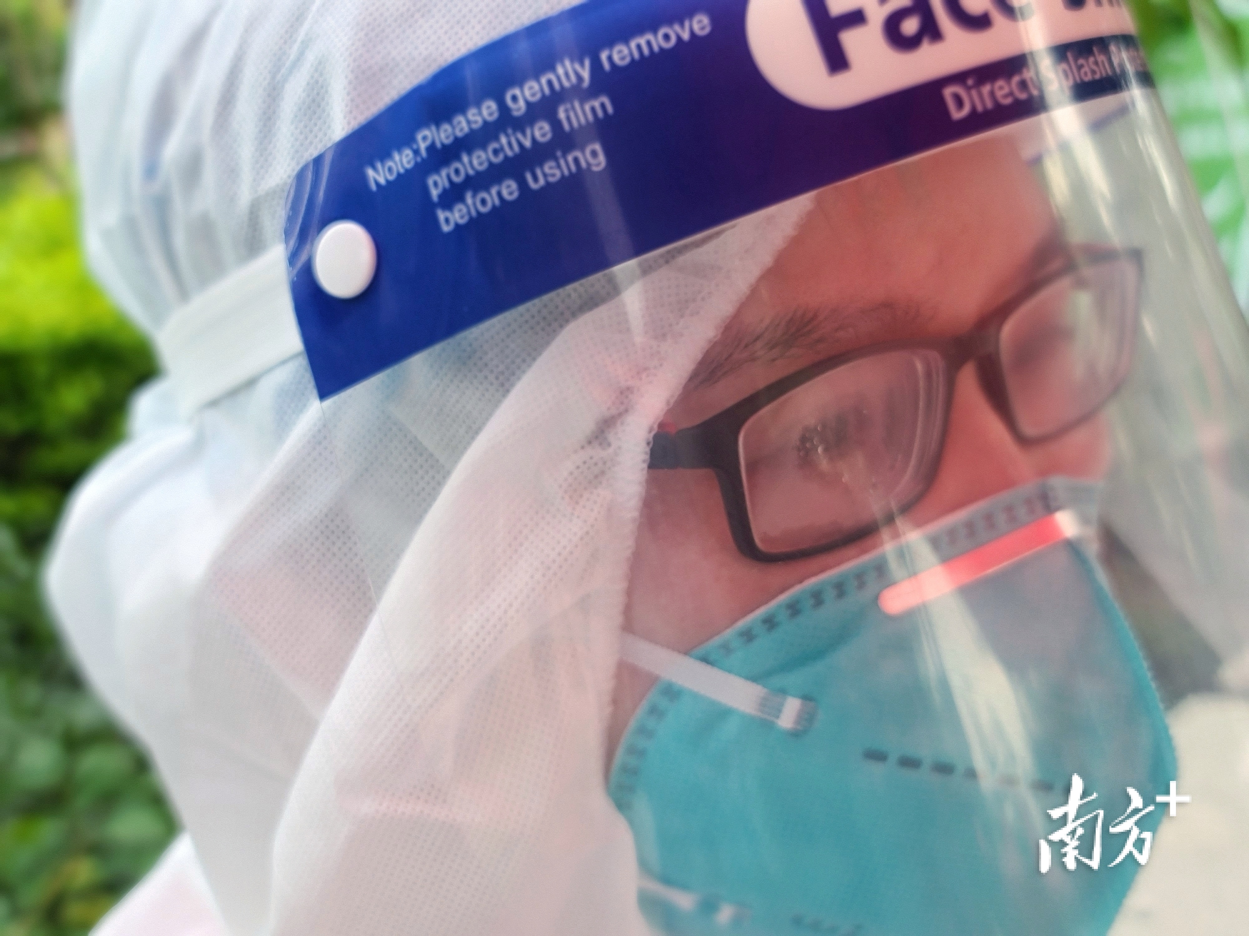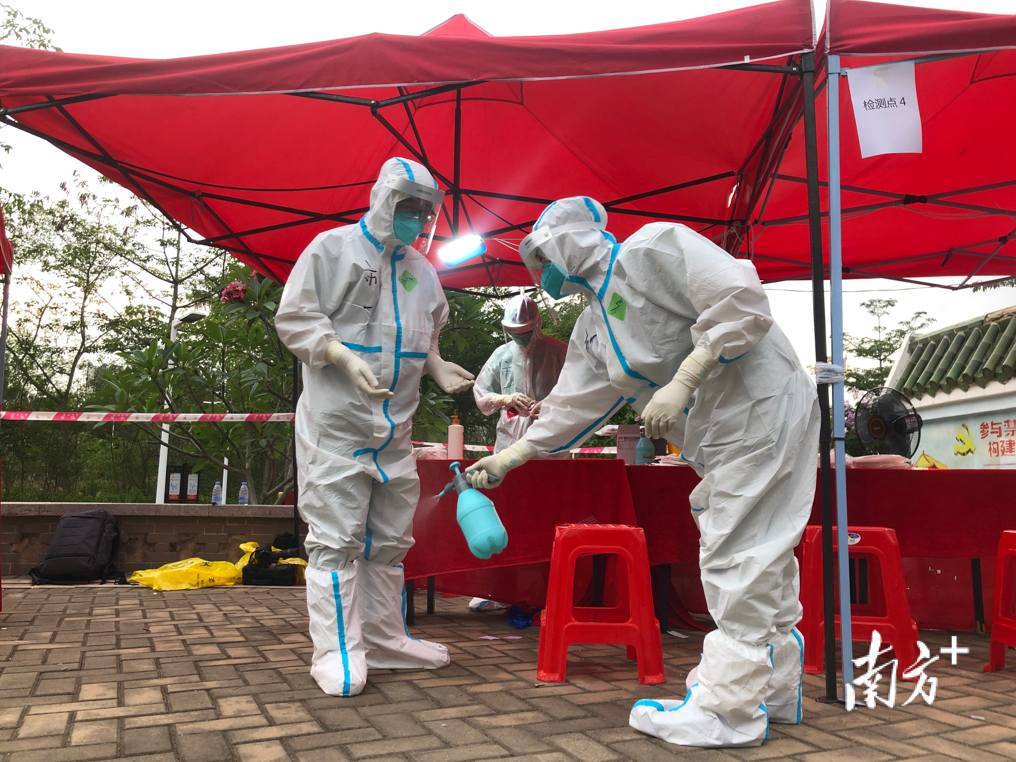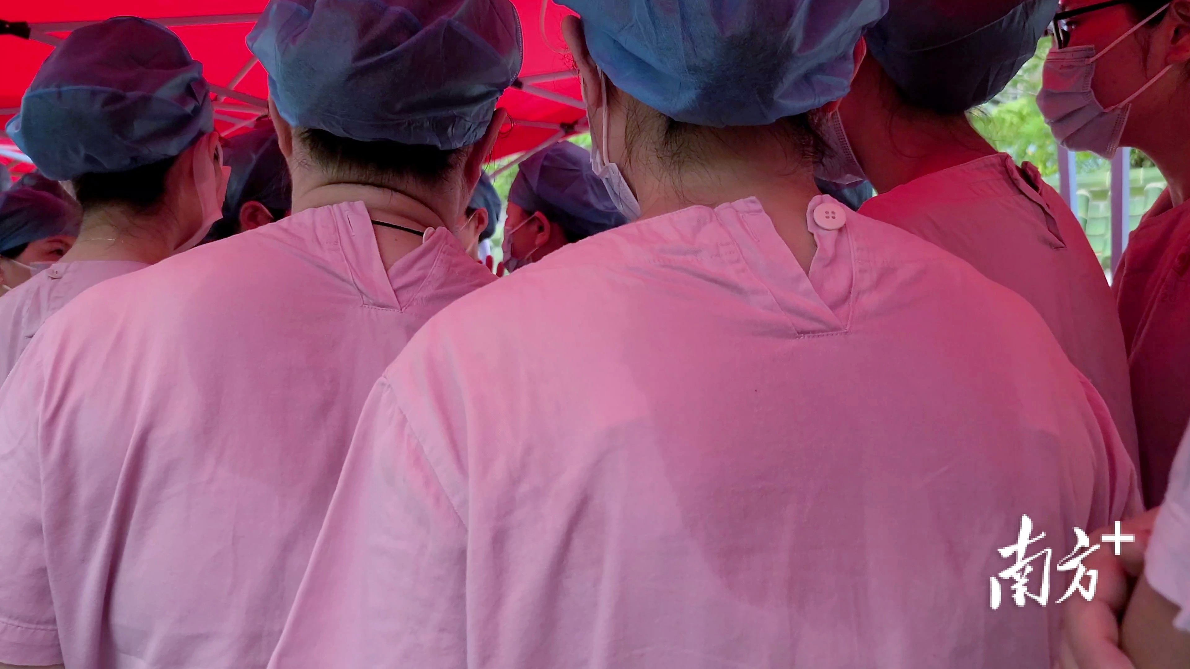 惠州市第一妇幼保健院15名医护人员同样来到大亚湾,他们正在为核酸采样做最后的准备,由于天气闷热,还没穿上隔离衣的他们已经是汗流浃背。