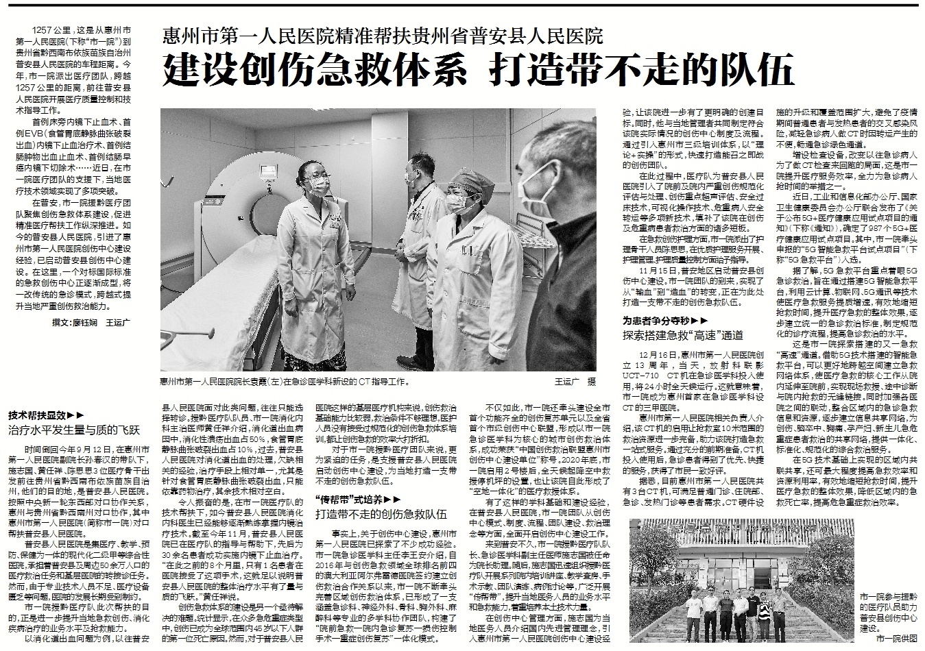 在普安,市一院援黔医疗团队聚焦创伤急救体系建设,促进精准医疗帮扶工作纵深推进。如今的普安县人民医院,引进了惠州市第一人民医院创伤中心建设经验,已正式启动普安县创伤中心建设。在这里,一个对标国际标准的急救创伤中心正逐渐成型,将一改传统的急诊模式,跨越式提升当地严重创伤救治能力。