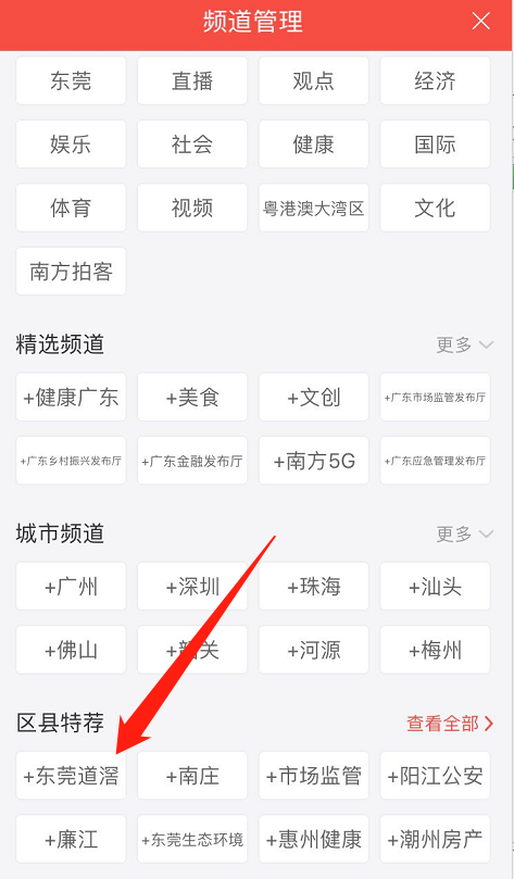 进入“频道管理”页面,在“区县推荐”栏点击“东莞道滘”。