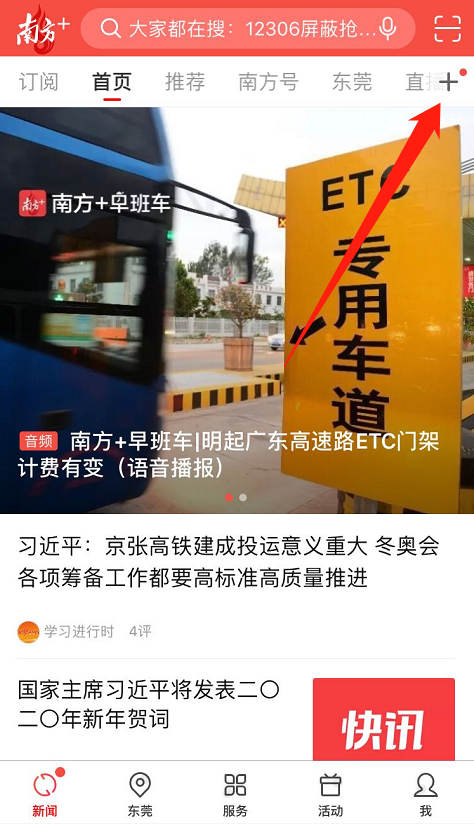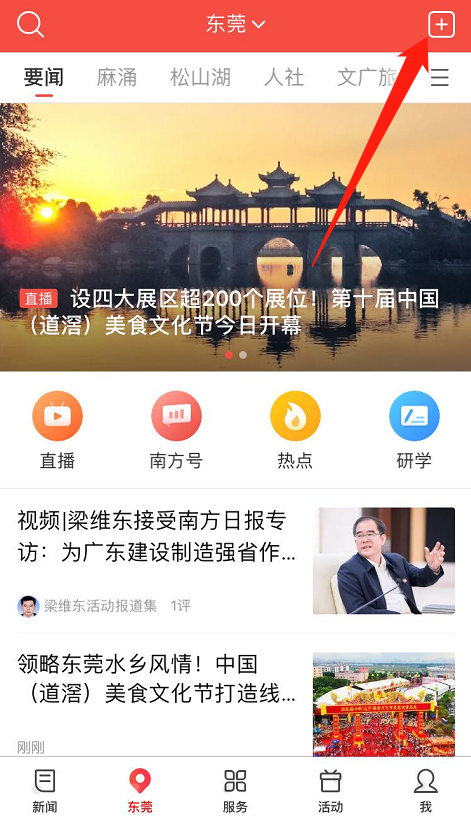 打开南方+新闻客户端,点击顶部右上方的“+”号。
