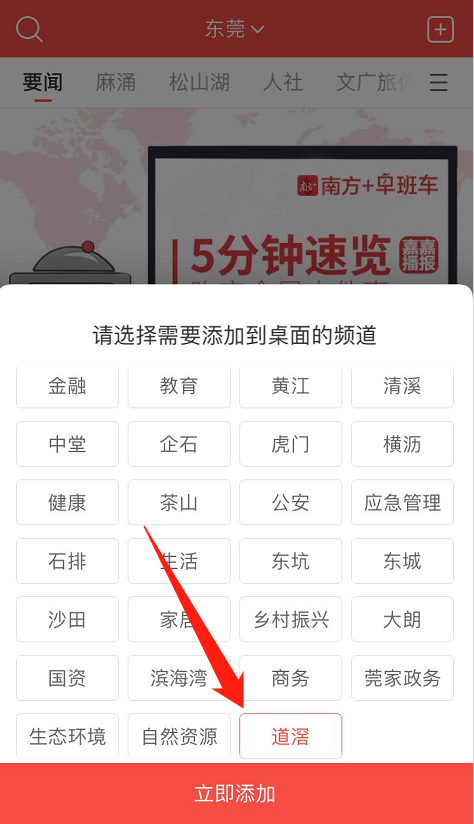 选择“道滘”频道,点击“立即添加”。按照操作指引添加至桌面。