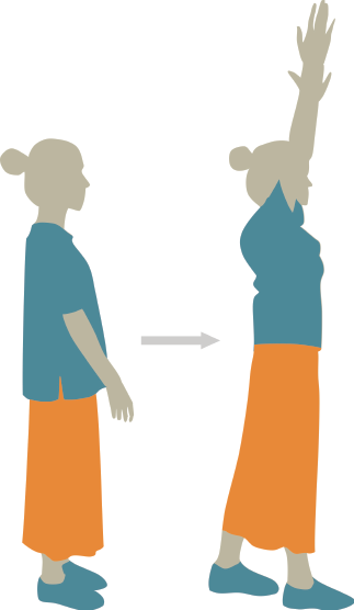 伸直肘部,举起双手到头顶,手心向内,注意手应画弧从下经正前方竖直举起,边弯曲肘部边沿体侧落下。伸直肘部在体侧。以肩关节为轴心在体侧绕环一周。