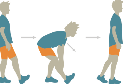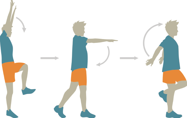 一侧髋关节弯曲抬起,同时举起双手。同时落下双手和这侧的腿。顺势向后上方抬起双手和这侧的腿,重复同样的动作。