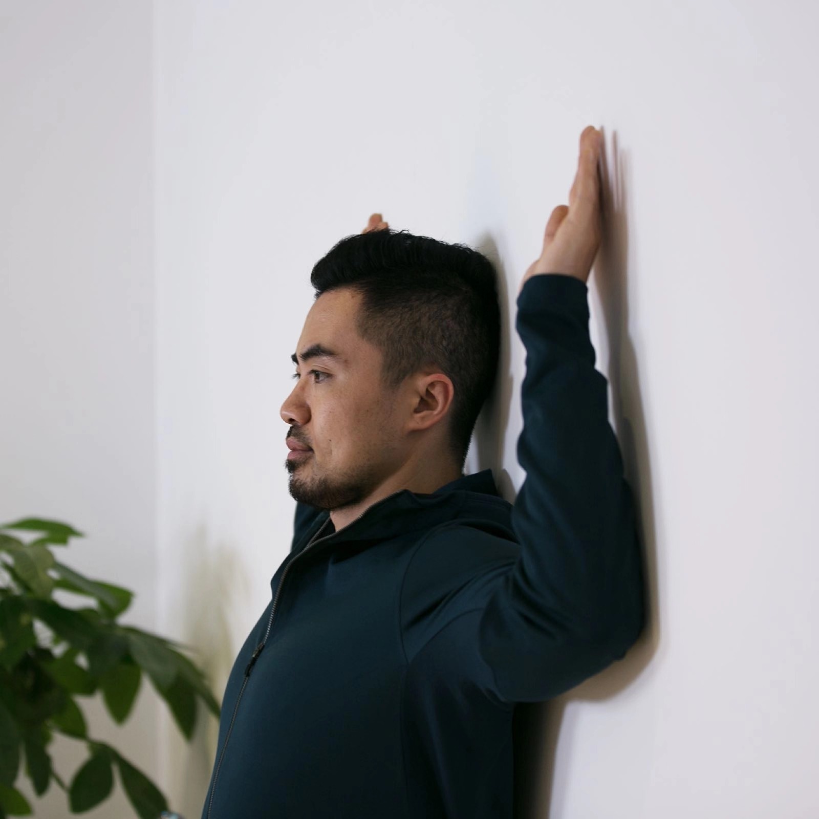 靠墙站立,手臂上举如投降状;掌心向前,两腿分开与肩同宽,膝盖微屈,脚跟离墙10cm;臀部靠墙,并让腰尽量往墙上贴,让整个背部贴着墙;头往墙上靠,并让手腕与五指同时贴近墙。如果此时手腕和五指不能同时贴近墙,或背部不能贴着墙,则说明胸椎比较僵硬。