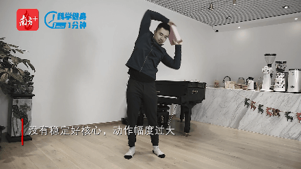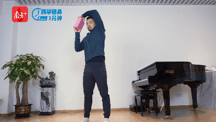 动作要点:放松腰部周边肌肉,可以用字典、小哑铃等重物辅助,双手举着重物在头顶绕圈。