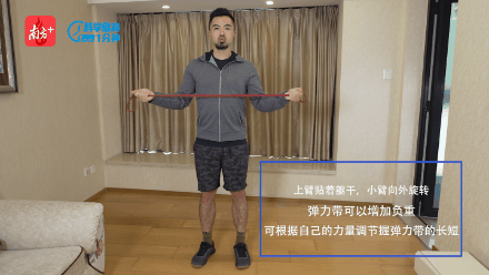 动作要点:上臂贴着躯干,小臂向外旋转,弹力带可以增加负重。可根据自己的力量调节手握弹力带的长短。
