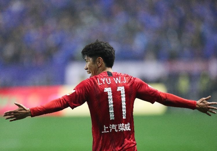 3月1日,上海上港队球员吕文君在比赛中庆祝进球。新华社记者丁汀摄