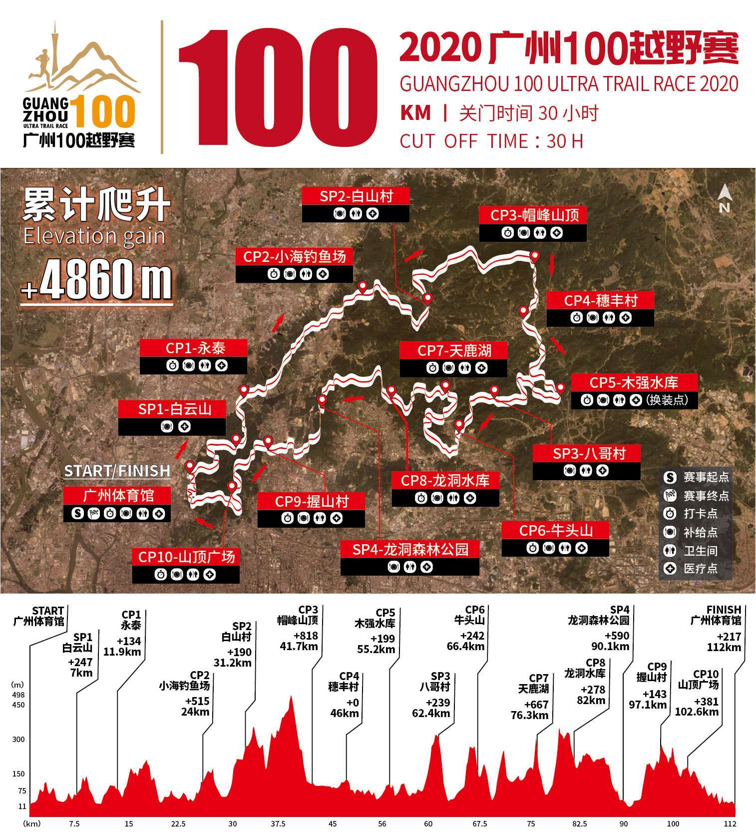 100公里组:实际距离112公里,关门时间30小时,累计爬升4860米,ITRA积分5分(已认证)。路线:广州体育馆东广场(起点)-云溪生态公园-白云山(SP1)-永泰(CP1)-六片山-小海钓鱼场(CP2)- -帽峰山森林公园-白山村(SP2)-帽峰山顶(CP3)-穗丰村(CP4)-木强水库(CP5)-八哥村(SP3)-牛头山(CP6)-天鹿湖(CP7)-龙洞水库(CP8)-龙洞森林公园(SP4)-握山村(CP9)-白云山山顶广场(CP10)-广州体育馆东广场(终点)