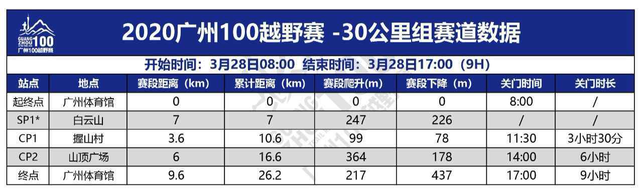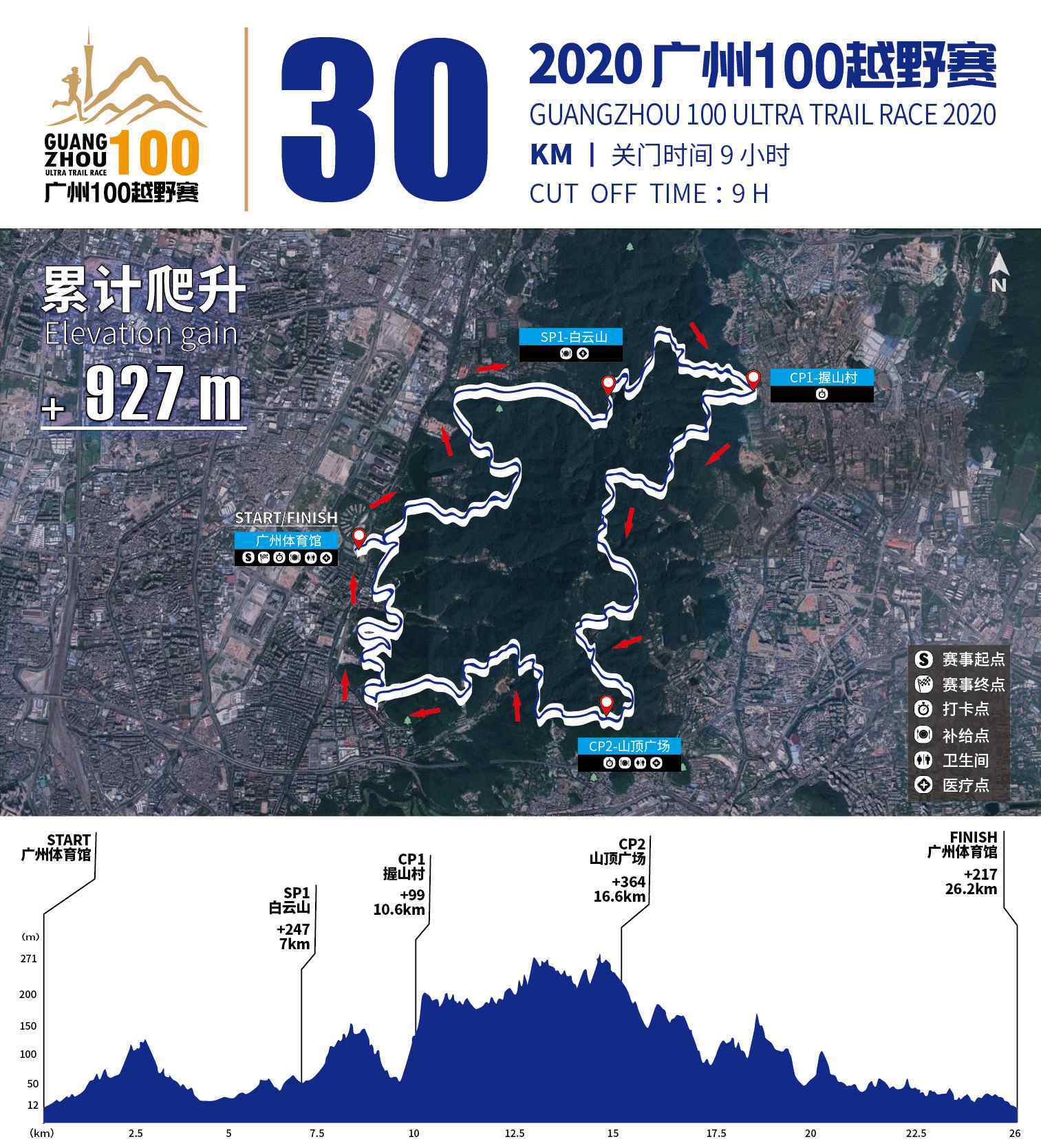 30公里组:实际距离26公里,关门时间9小时,累计爬升927米,ITRA积分1分(已认证)。路线:广州体育馆东广场(起点)-云溪生态公园-白云山(SP1)-握山村(CP1)-天南第一峰-白云滑道(CP2)-广州体育馆东广场(终点)