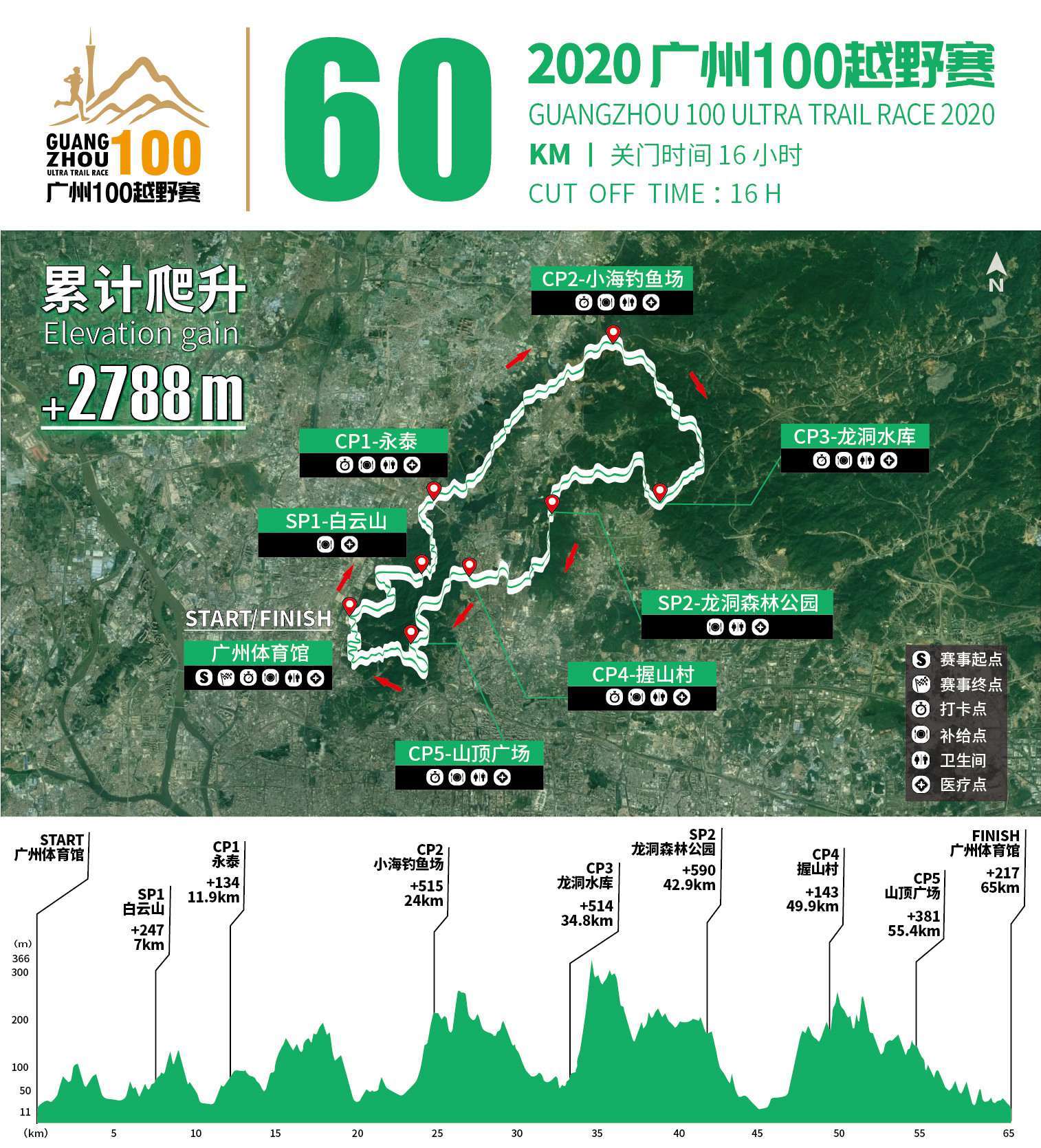 60公里组:实际距离65公里,关门时间16小时,累计爬升2788米,ITRA积分3分(已认证)。路线:广州体育馆东广场(起点)-云溪生态公园-白云山(SP1)-永泰(CP1)-六片山-小海钓鱼场(CP2)-龙洞水库(CP3)-龙洞森林公园(SP2)-握山村(CP4)-白云山-山顶广场(CP5)-广州体育馆东广场(终点)