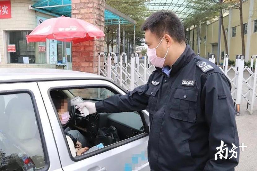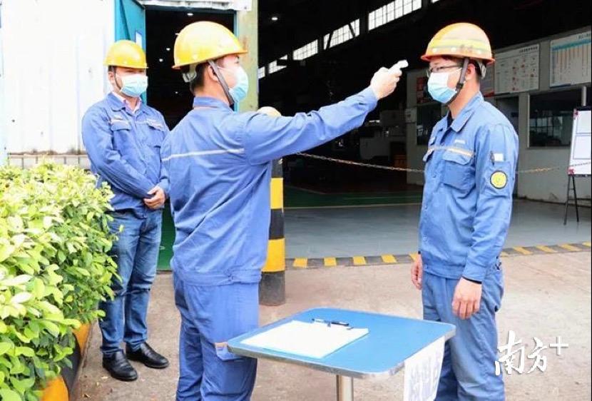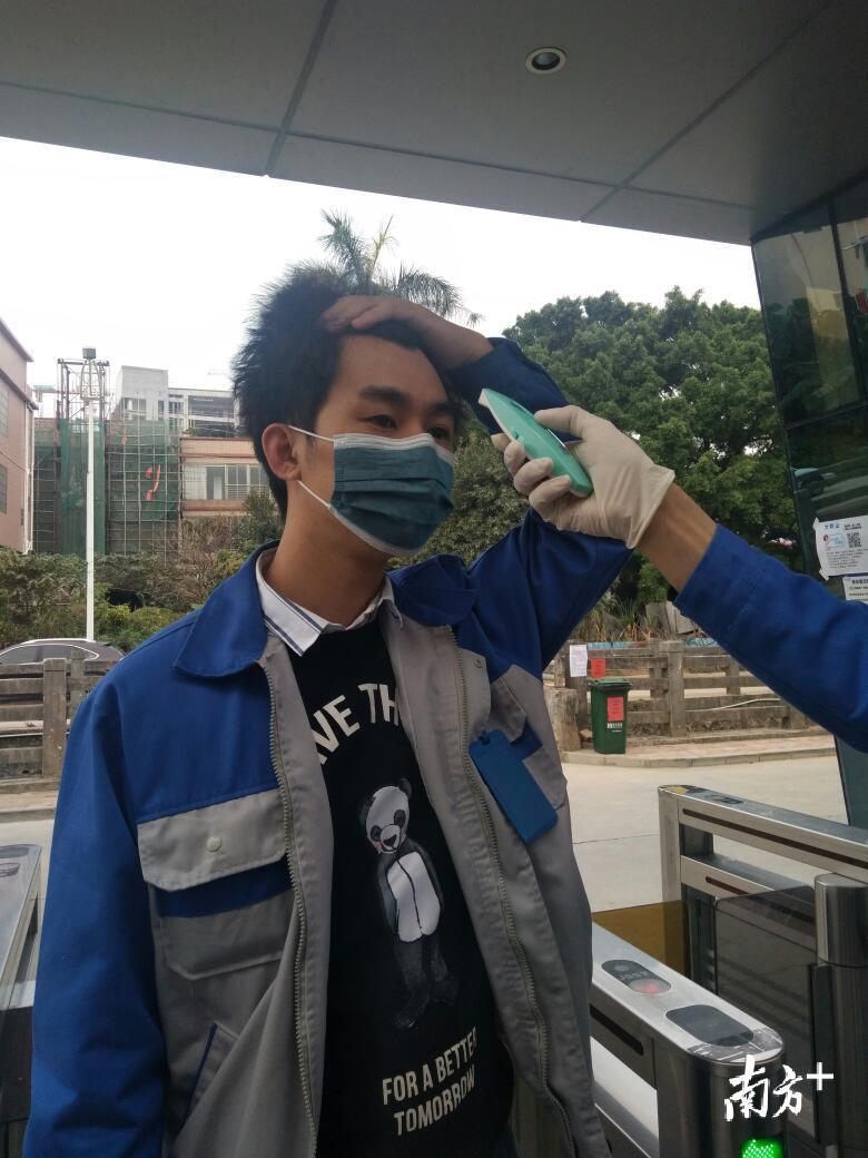 在东莞铭普光磁股份有限公司门口,保安正在给回来的员工逐一登记信息和测量体温。厂区门口设置了消毒、登记台,发放了口罩、洗手液给提前返厂的员工,通过测量体温,用消毒水对他们的鞋底等进行消毒,并做好一系列的排查登记,掌握员工动向。
