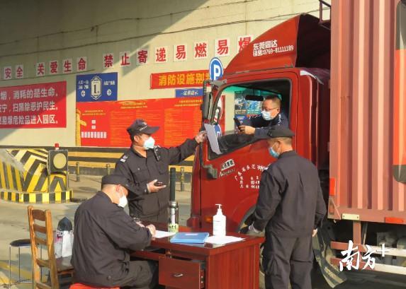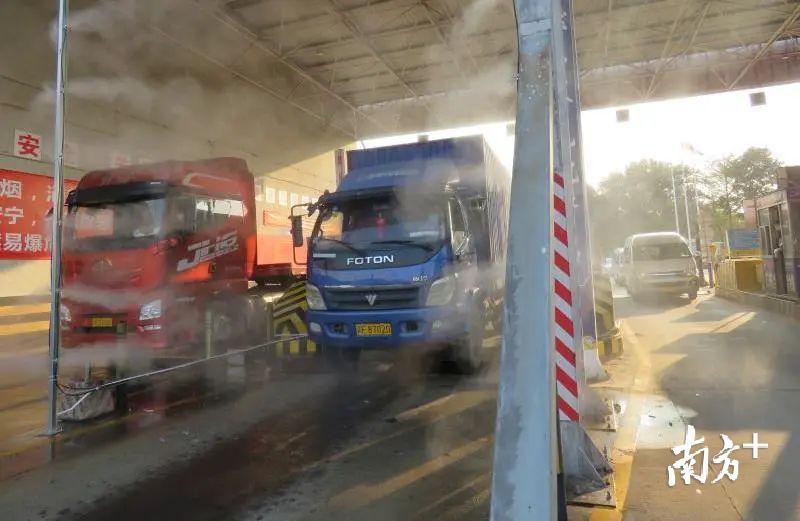 在东莞百茂物流城园区出入口,货车司乘人员正有序接受体温检测和信息登记,确认体温数据、籍贯信息等内容正常后,货车进入消毒通道,“接受”两旁消毒喷雾的喷洒。