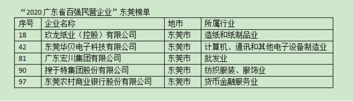 12月30日,广东省工商业联合会(总商会)发布“2020广东省百强民营企业”榜单(以下简称“榜单”)发布。记者梳理榜单发现有5家莞企入榜,它们分别是玖龙纸业、华贝电子、宏川集团、搜于特、东莞农商银行。据悉,“2020广东省百强民营企业”榜单入围门槛持续增长,达到111.4亿元,而入榜的5家莞企中玖龙纸业超600亿元排名榜单第18位,华贝电子超200亿元排名第42位。