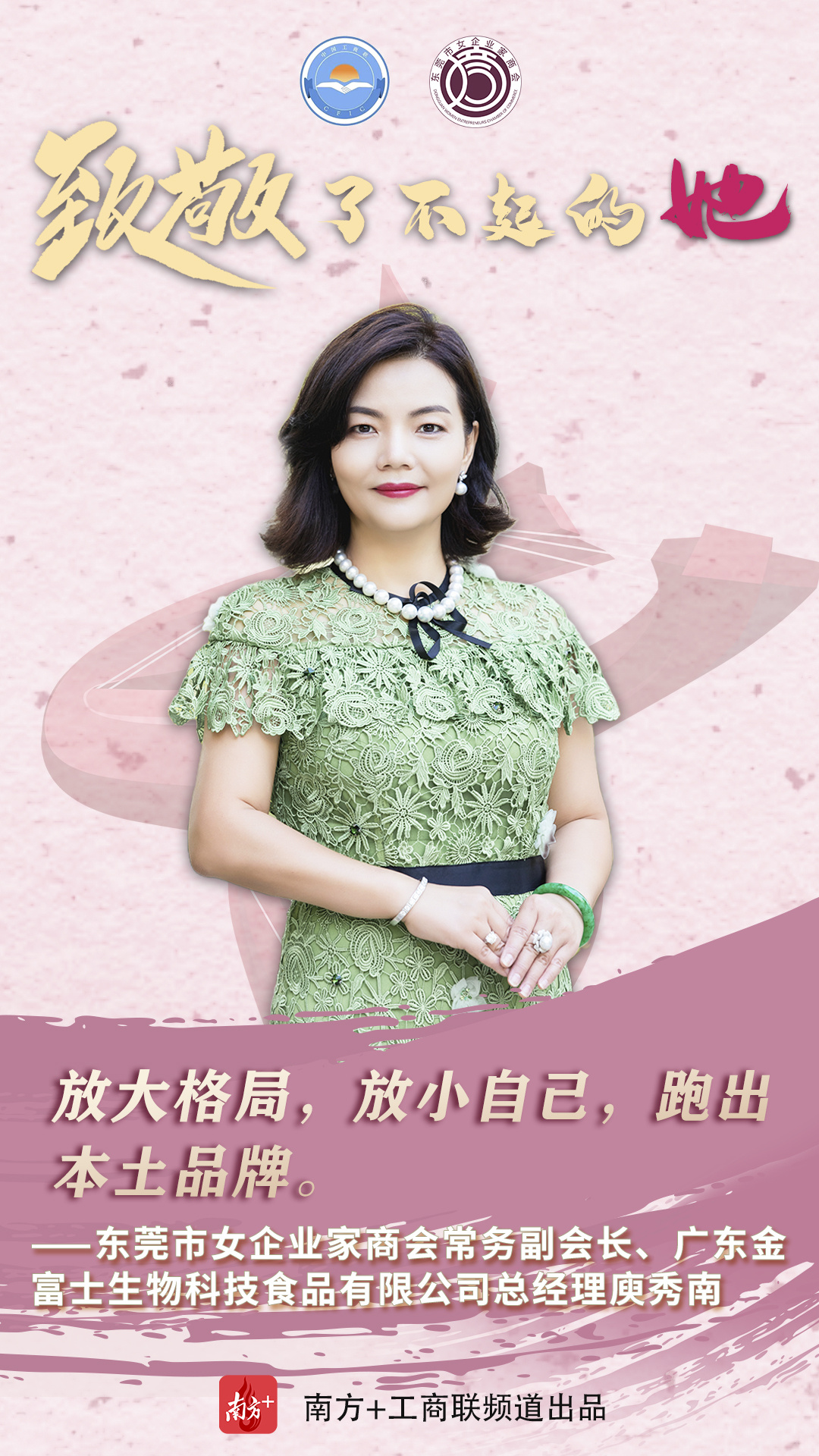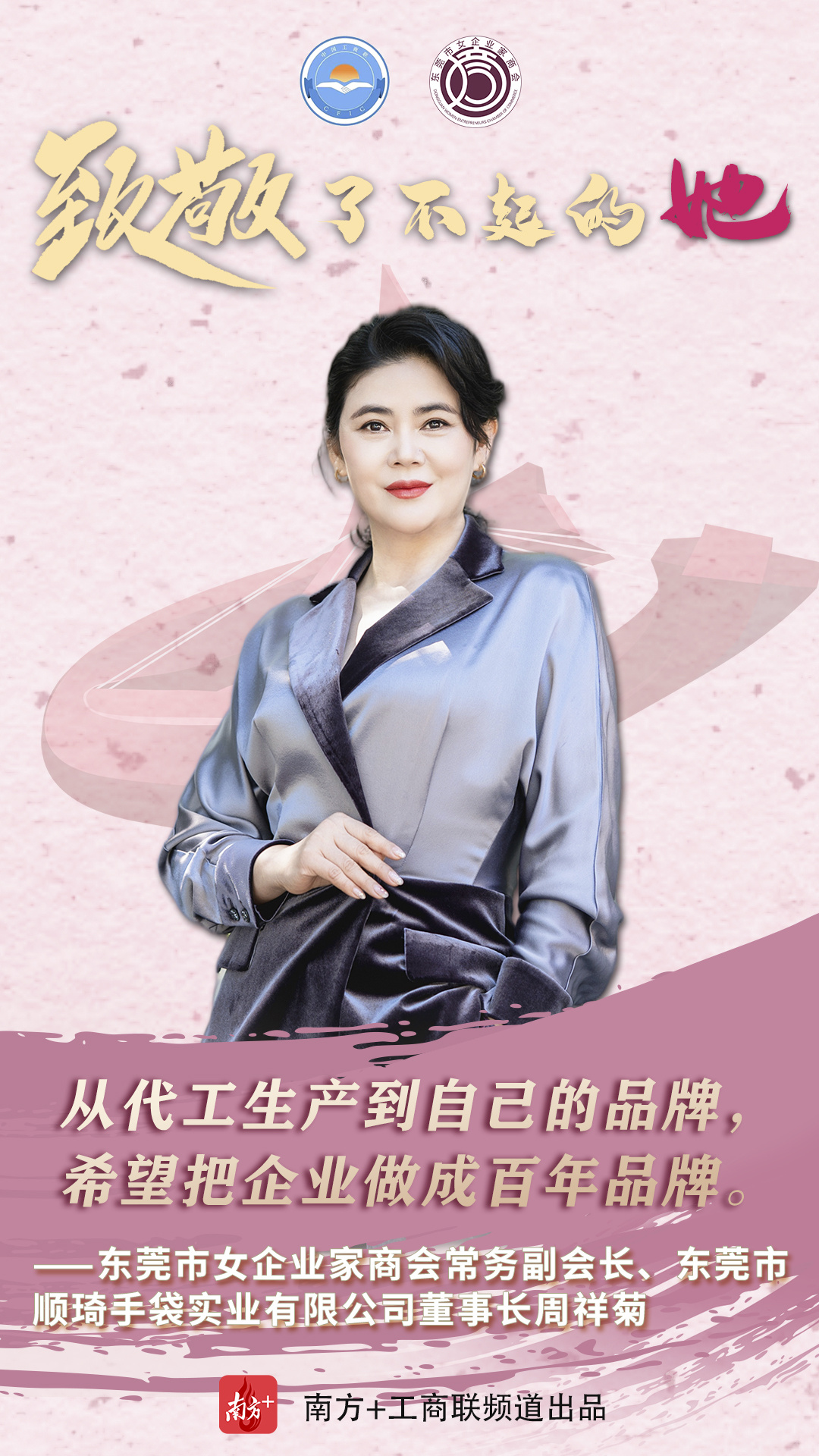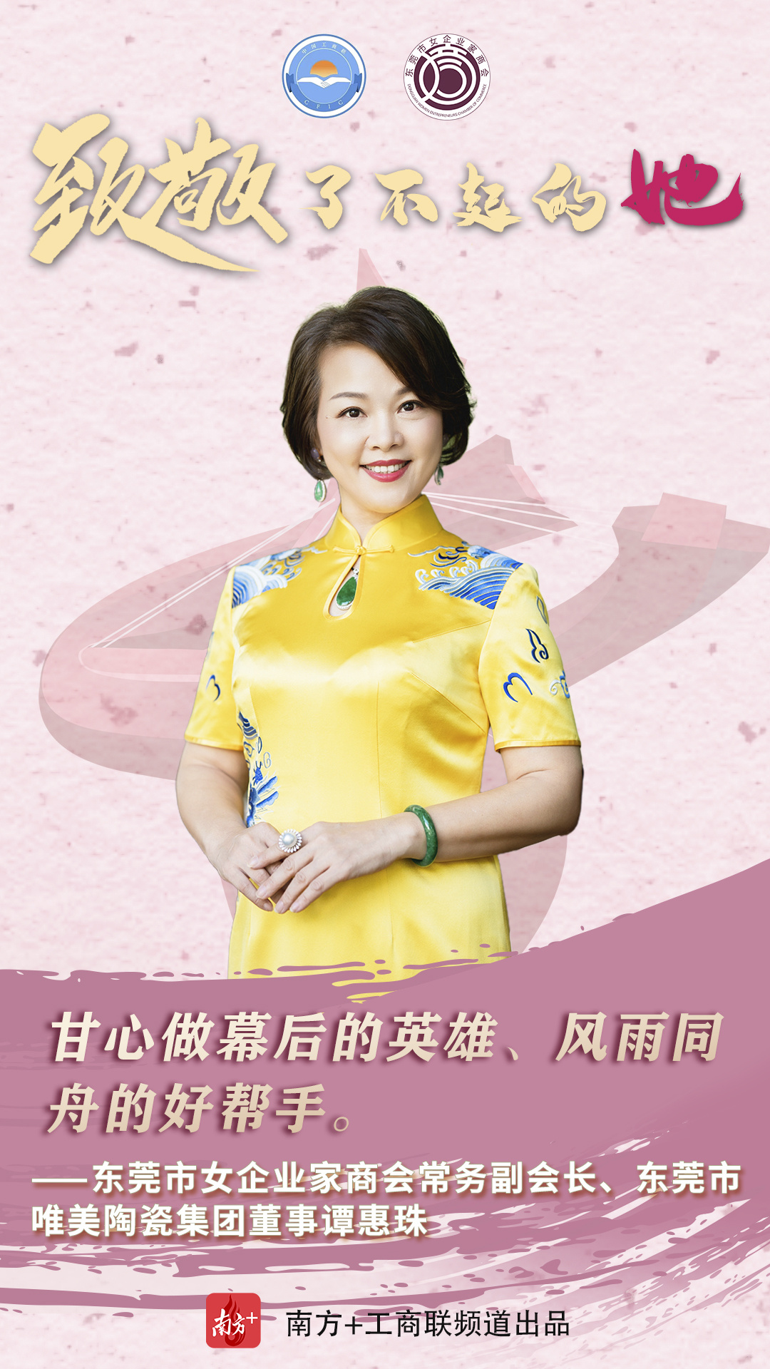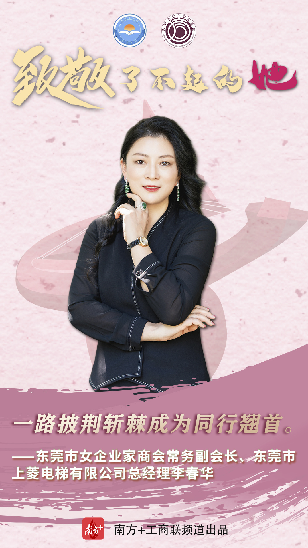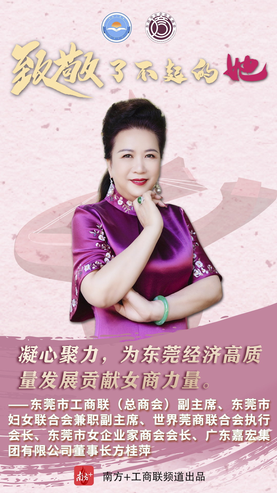 作为制造业立市的东莞,在职场上,她们是叱咤商界的女强人,凝心聚力为推动东莞经济高质量发展贡献力量;在家庭上,又是贤良淑德的妻子和母亲;在爱心奉献上,又是为善不甘人后的“慈善家”。在第111个“三八”国际妇女节来临之时,东莞市工商联(总商会)用10张海报、10个金句致敬了不起的东莞女商。