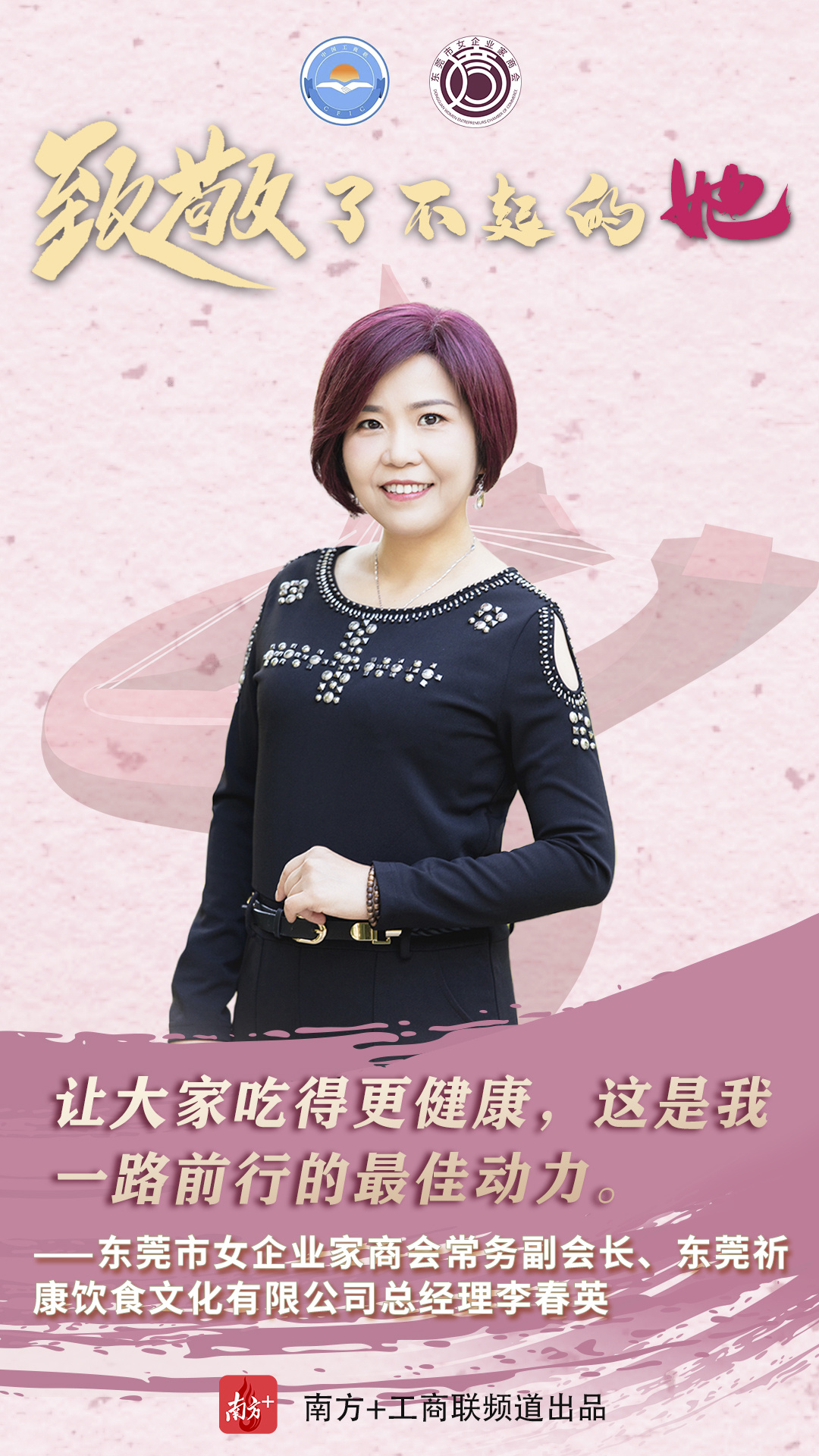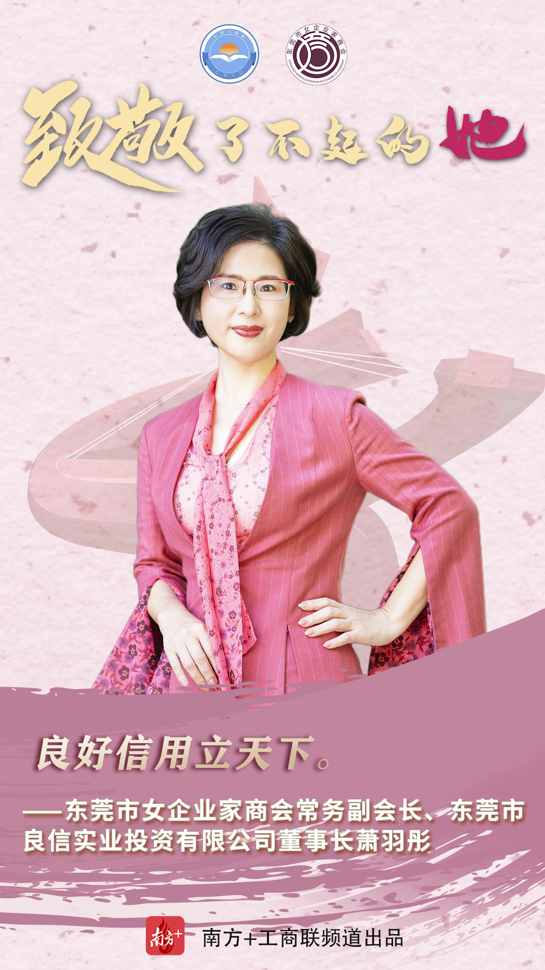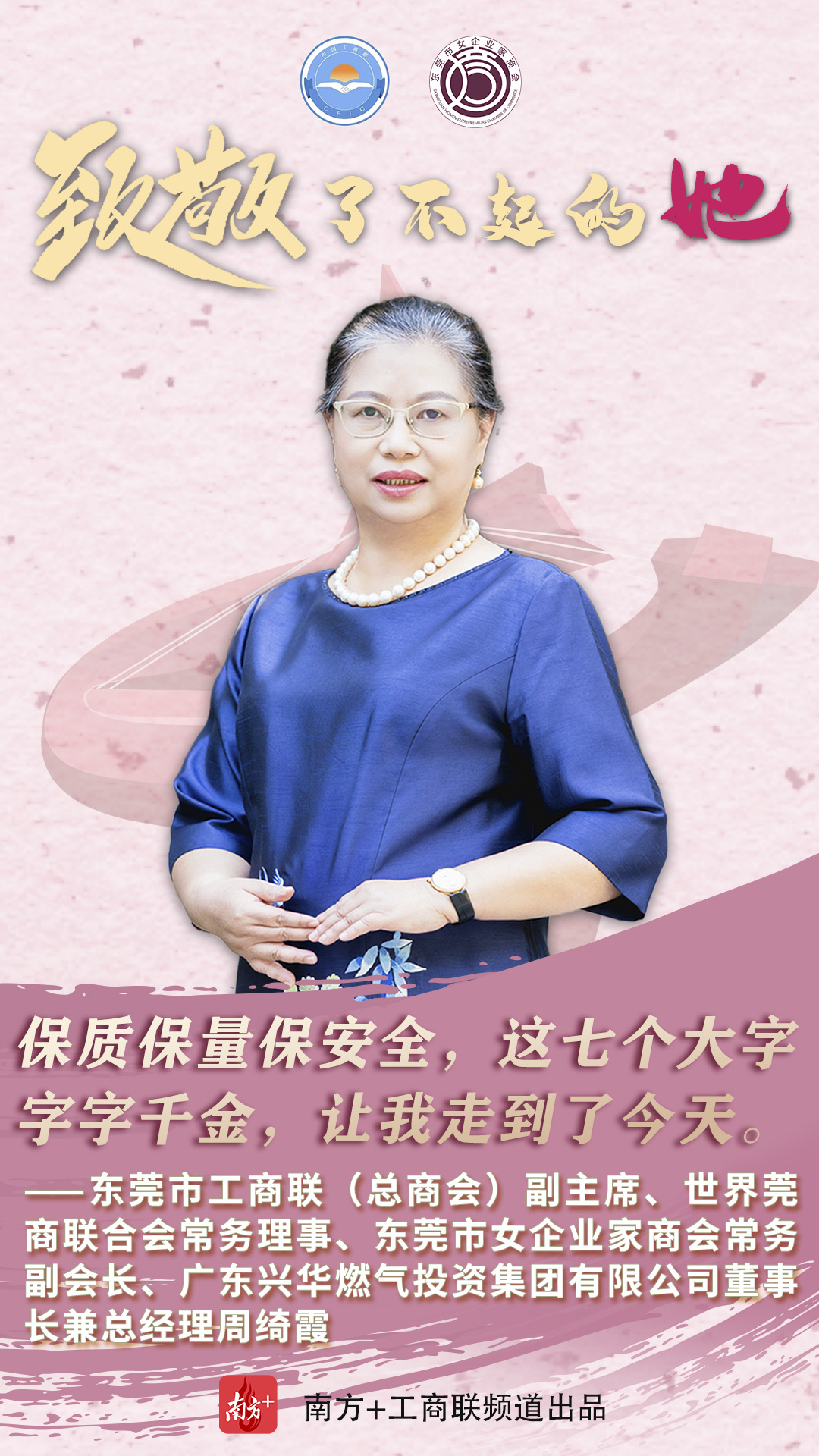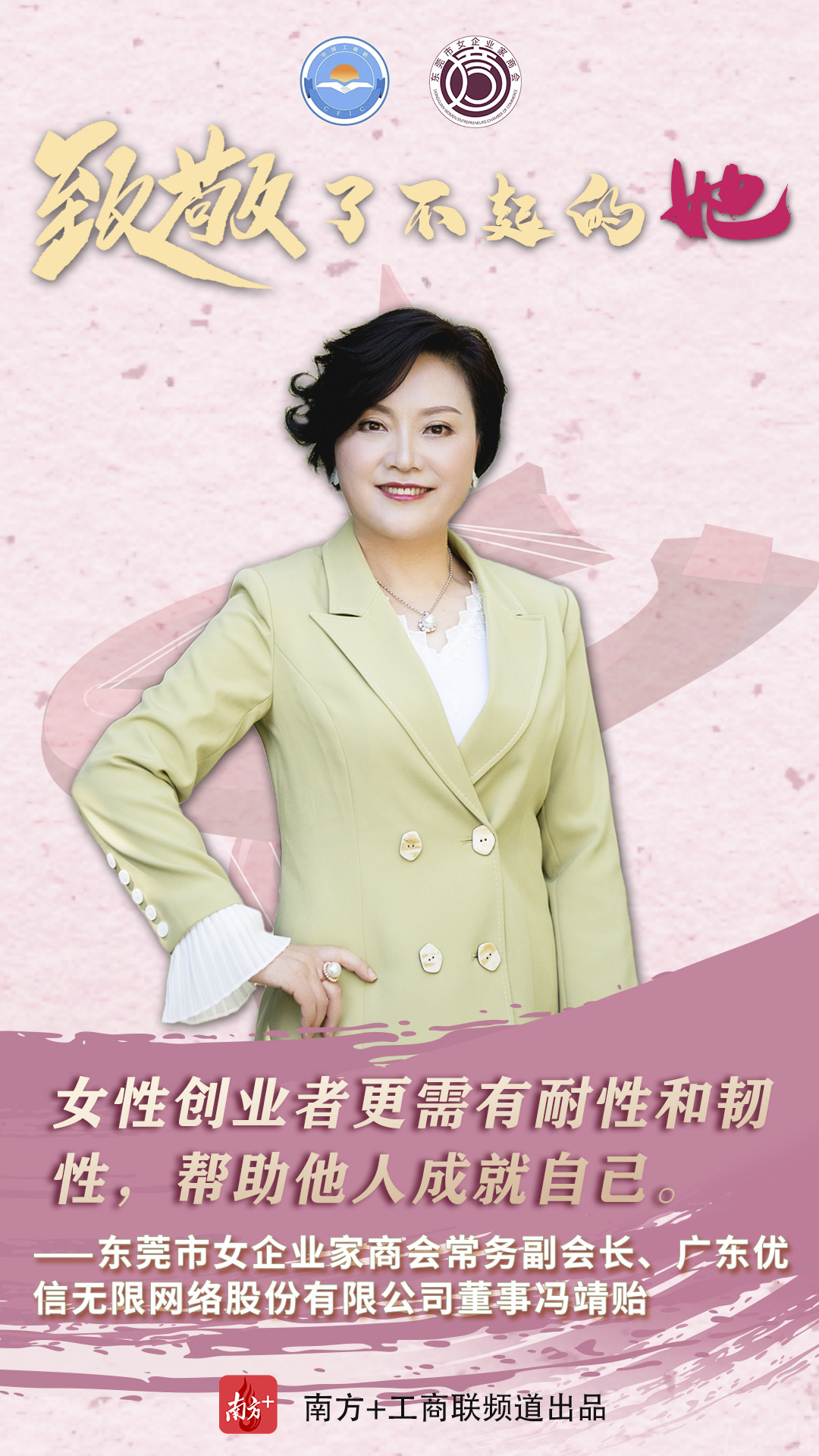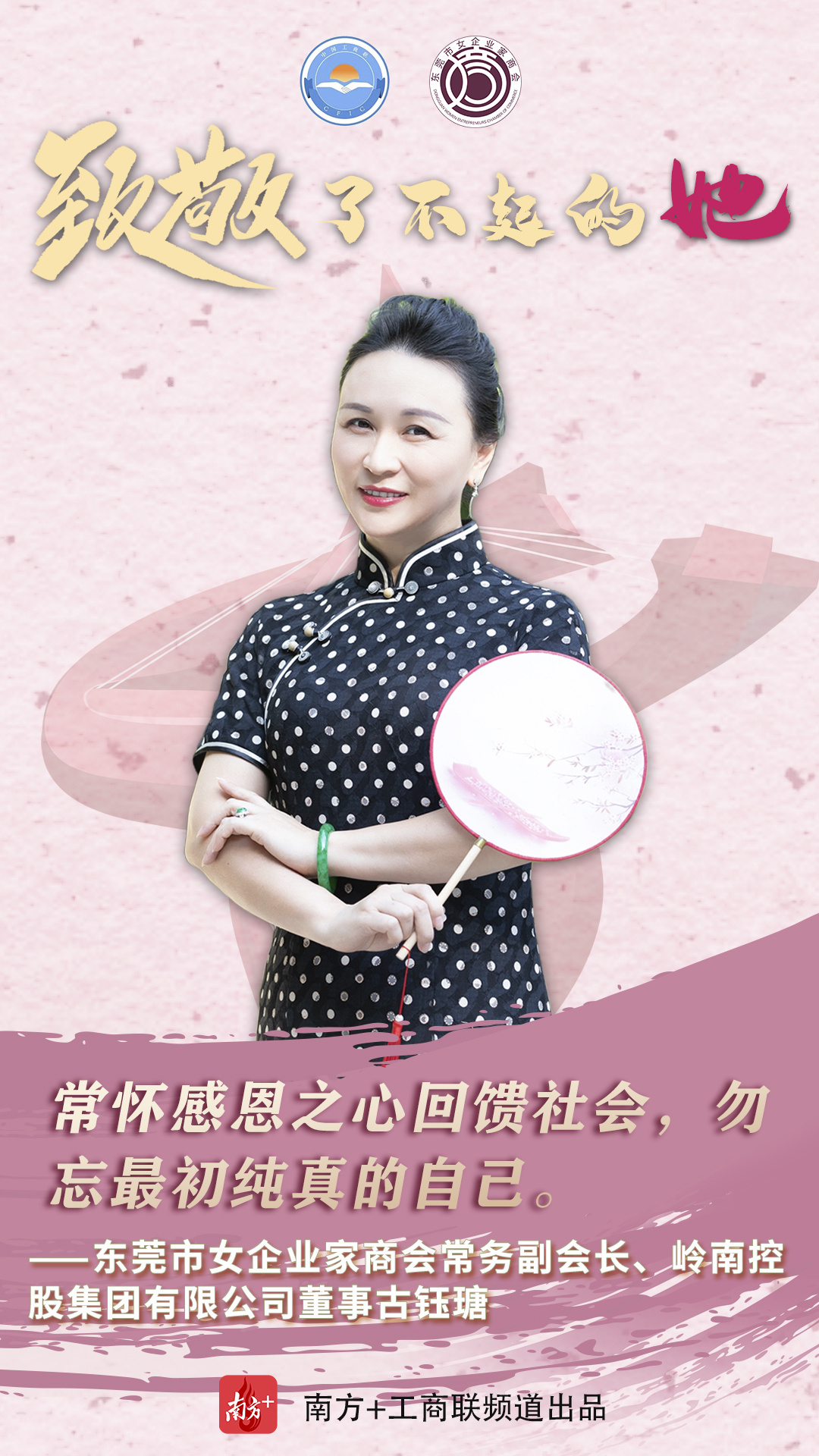 作为制造业立市的东莞,在职场上,她们是叱咤商界的女强人,凝心聚力为推动东莞经济高质量发展贡献力量;在家庭上,又是贤良淑德的妻子和母亲;在爱心奉献上,又是为善不甘人后的“慈善家”。在第111个“三八”国际妇女节来临之时,东莞市工商联(总商会)用10张海报、10个金句致敬了不起的东莞女商。