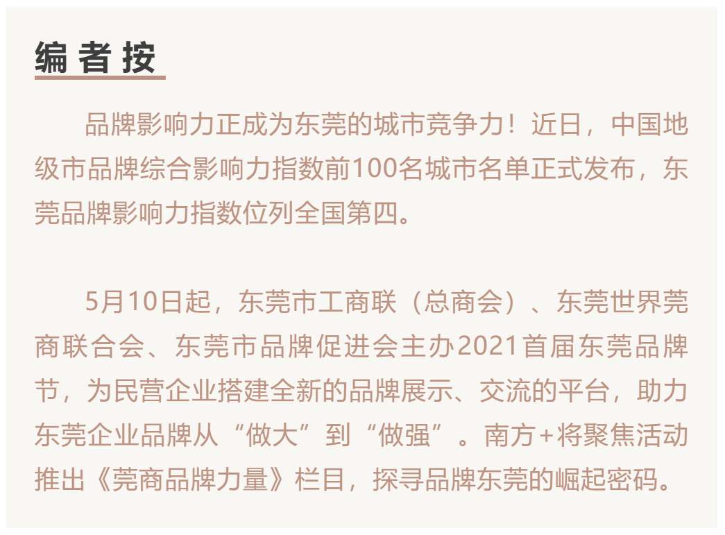 5月10日,籍今年中国品牌日之际和东莞市委、市政府开展“乐购东莞”活动之机,东莞市工商联(总商会)、东莞世界莞商联合会、东莞市品牌促进会主办的2021首届东莞品牌节(简称“东莞品牌节”)正式开幕。